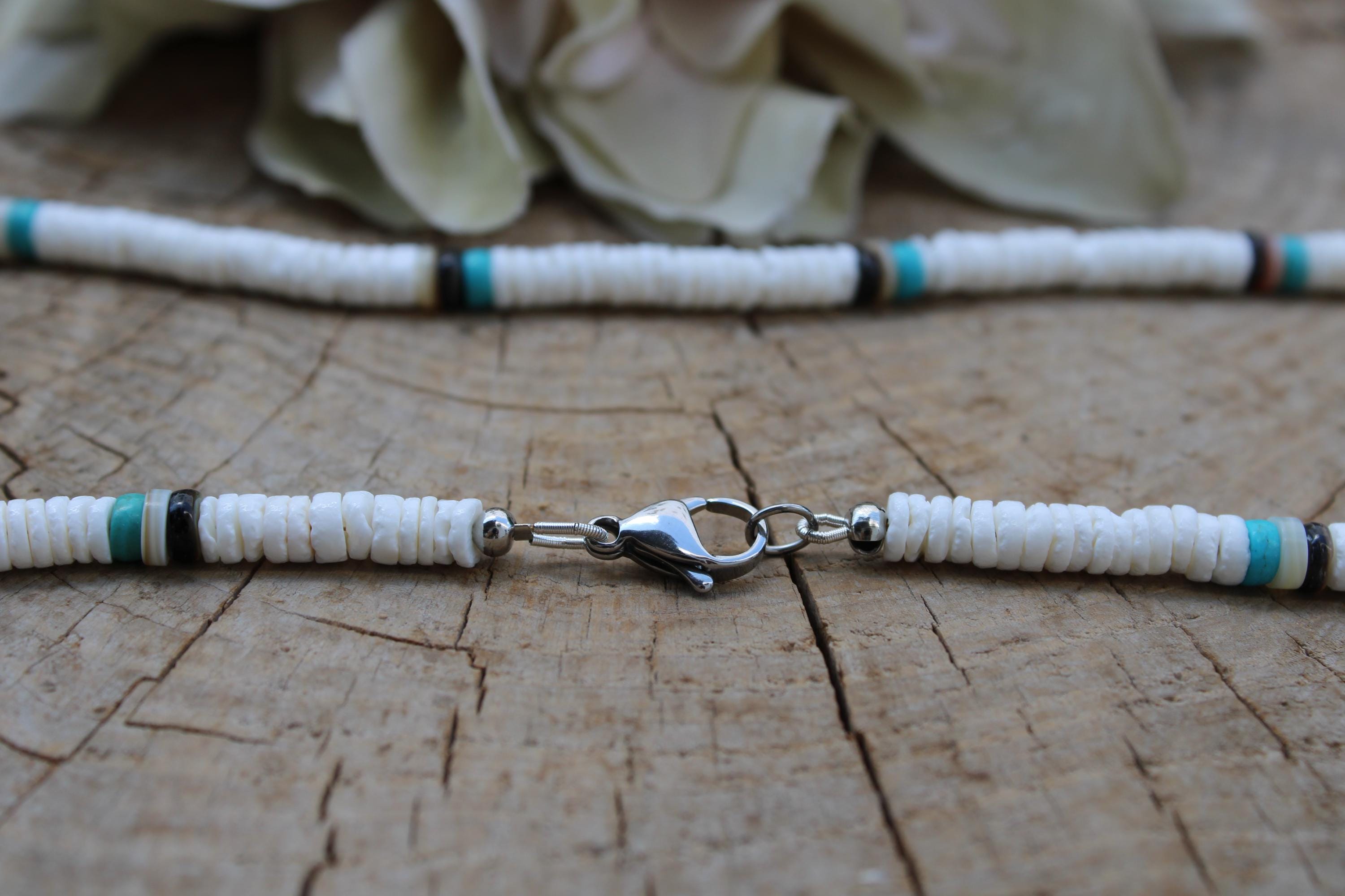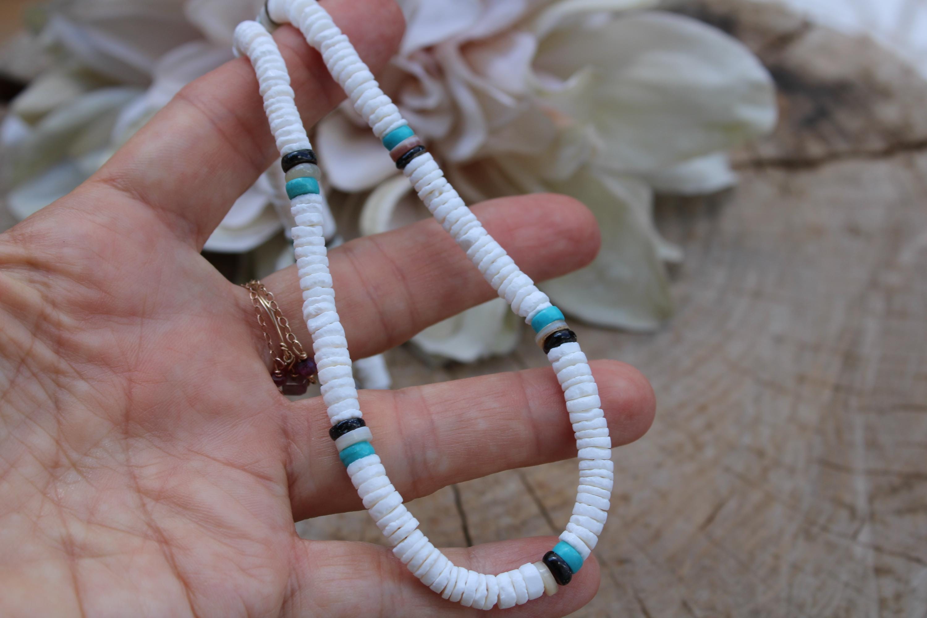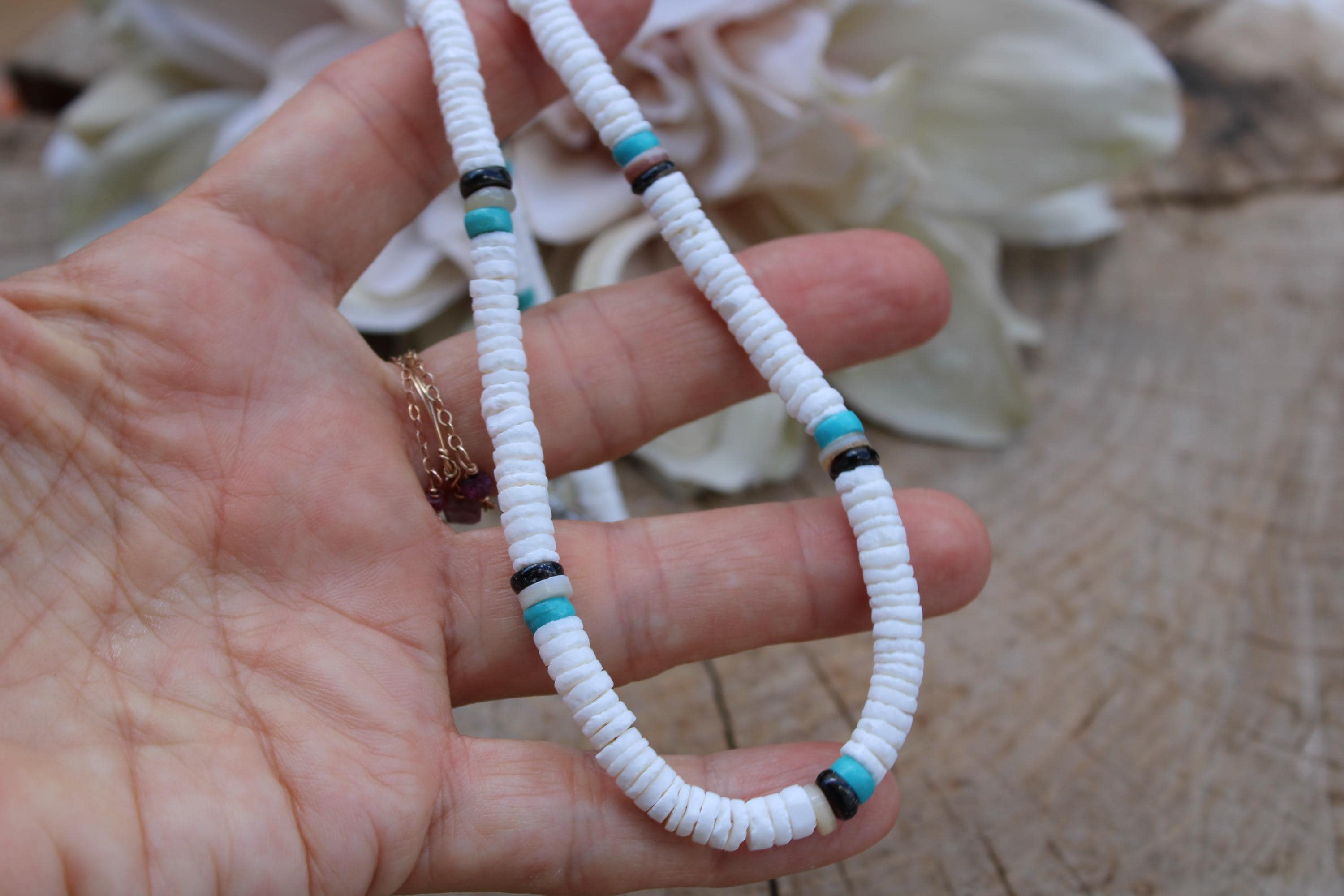 •It features white litub and freshwater shell heishi beads in earthy tones measuring around 5mm.