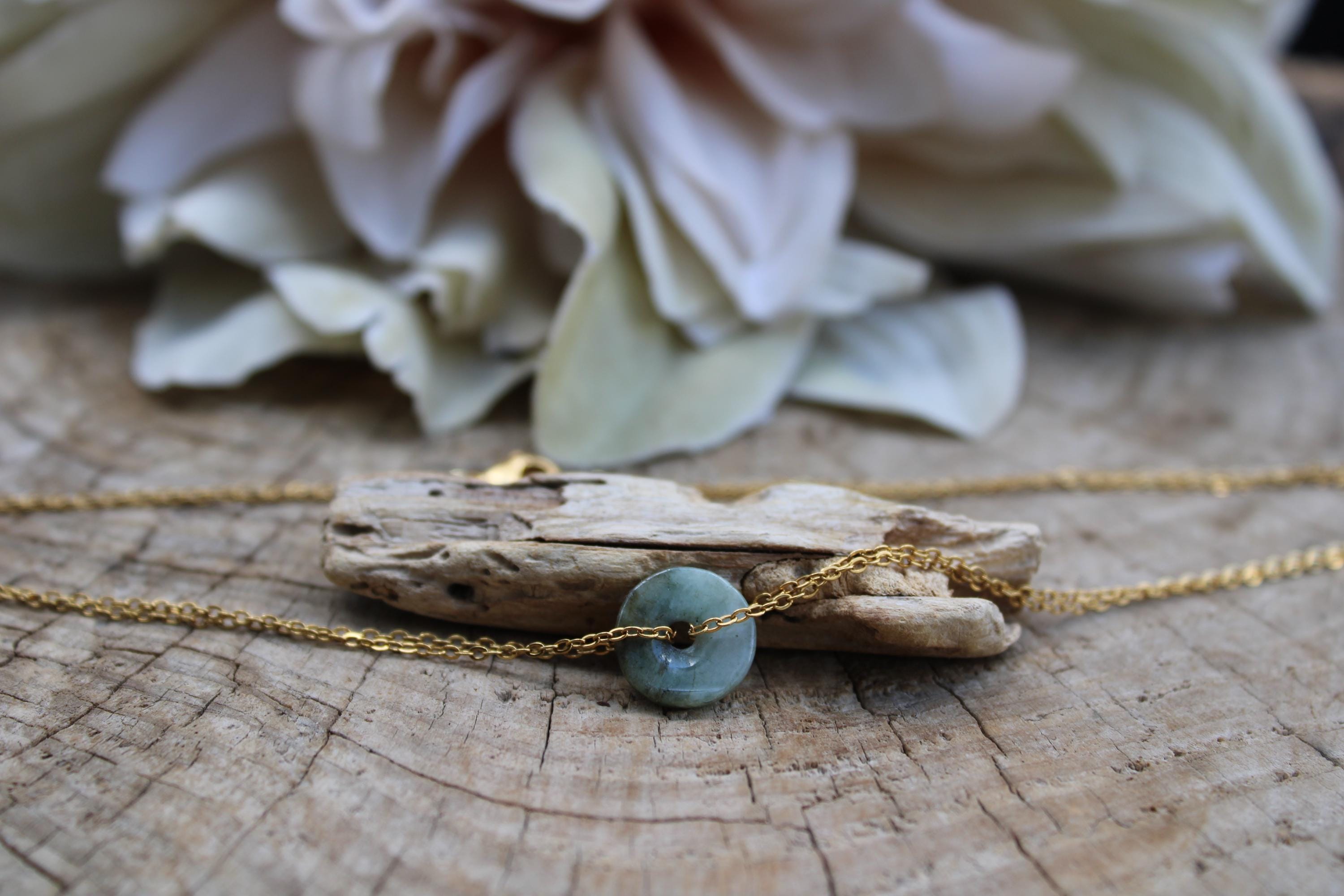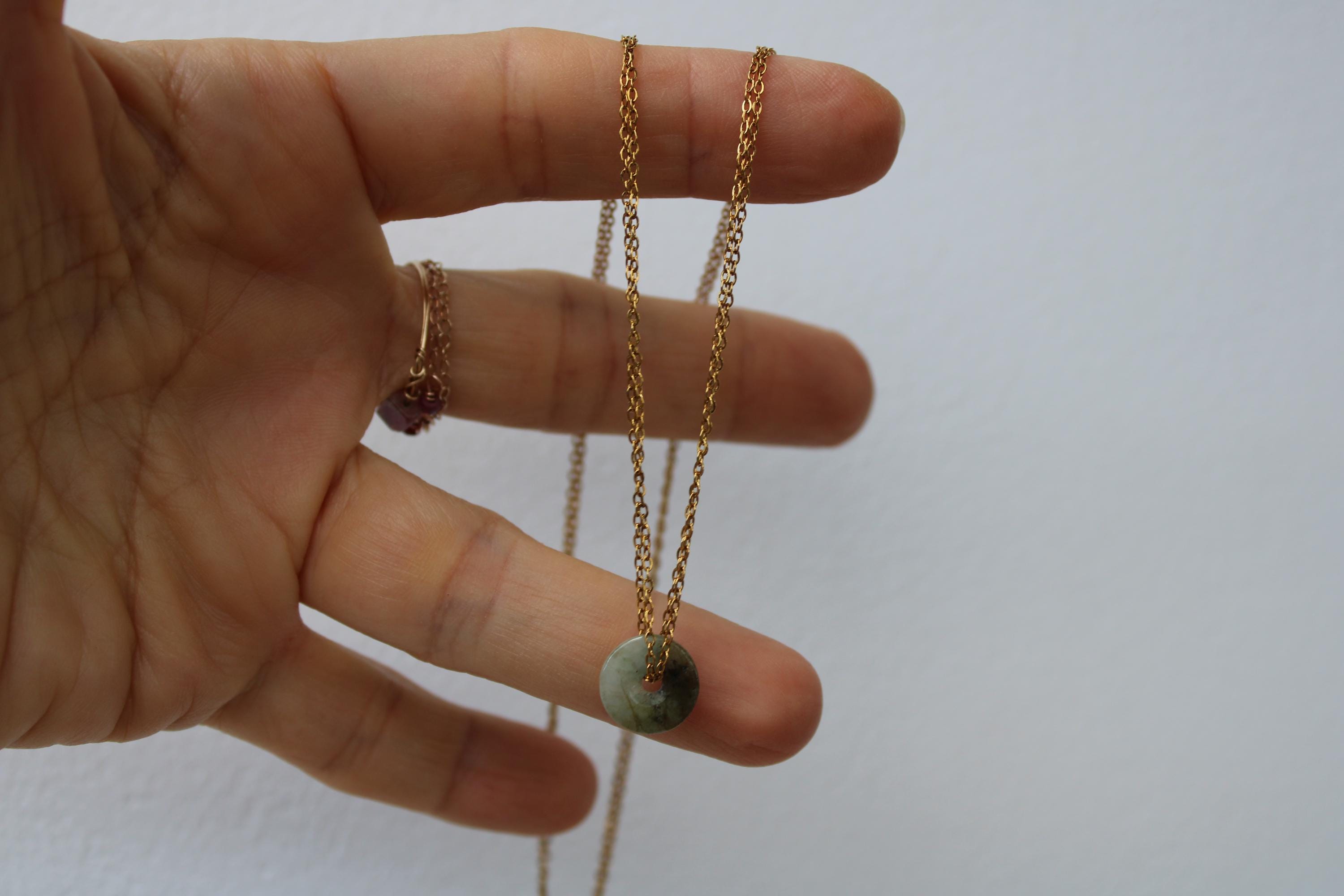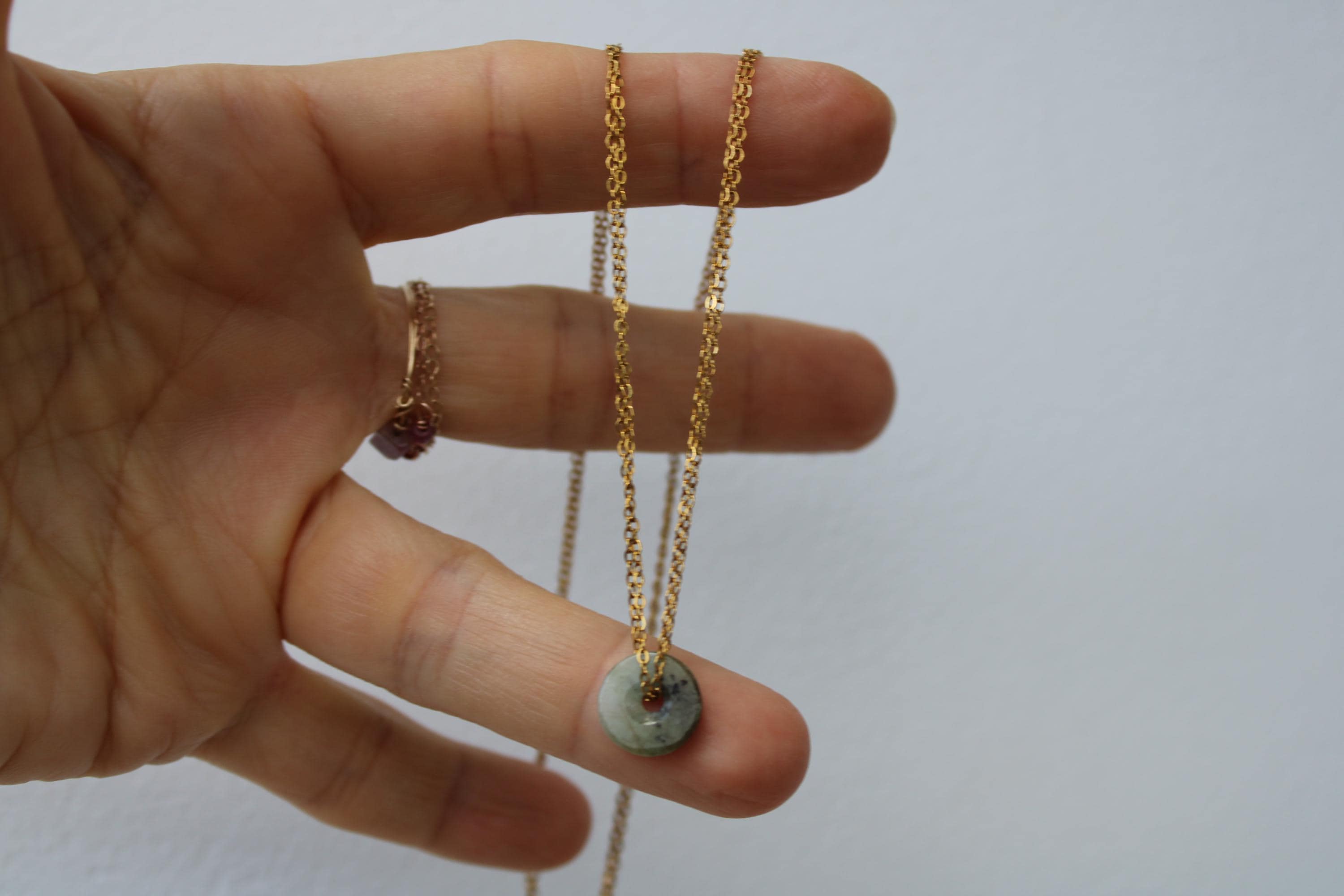 This necklace is features a genuine Burmese jade donut that is associated with good luck and prosperity. Personalise it by choosing the jade colour and chain of your choice.