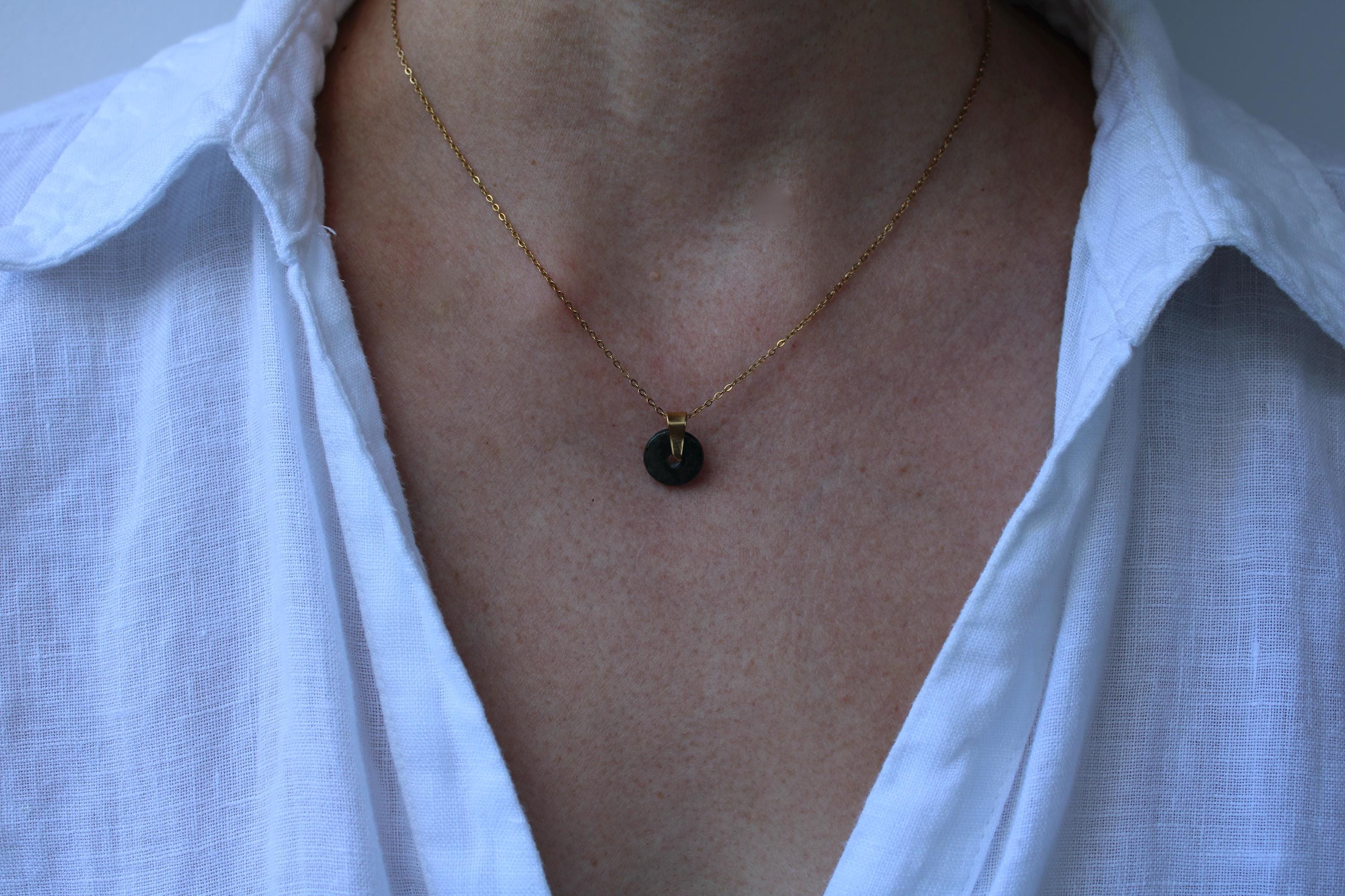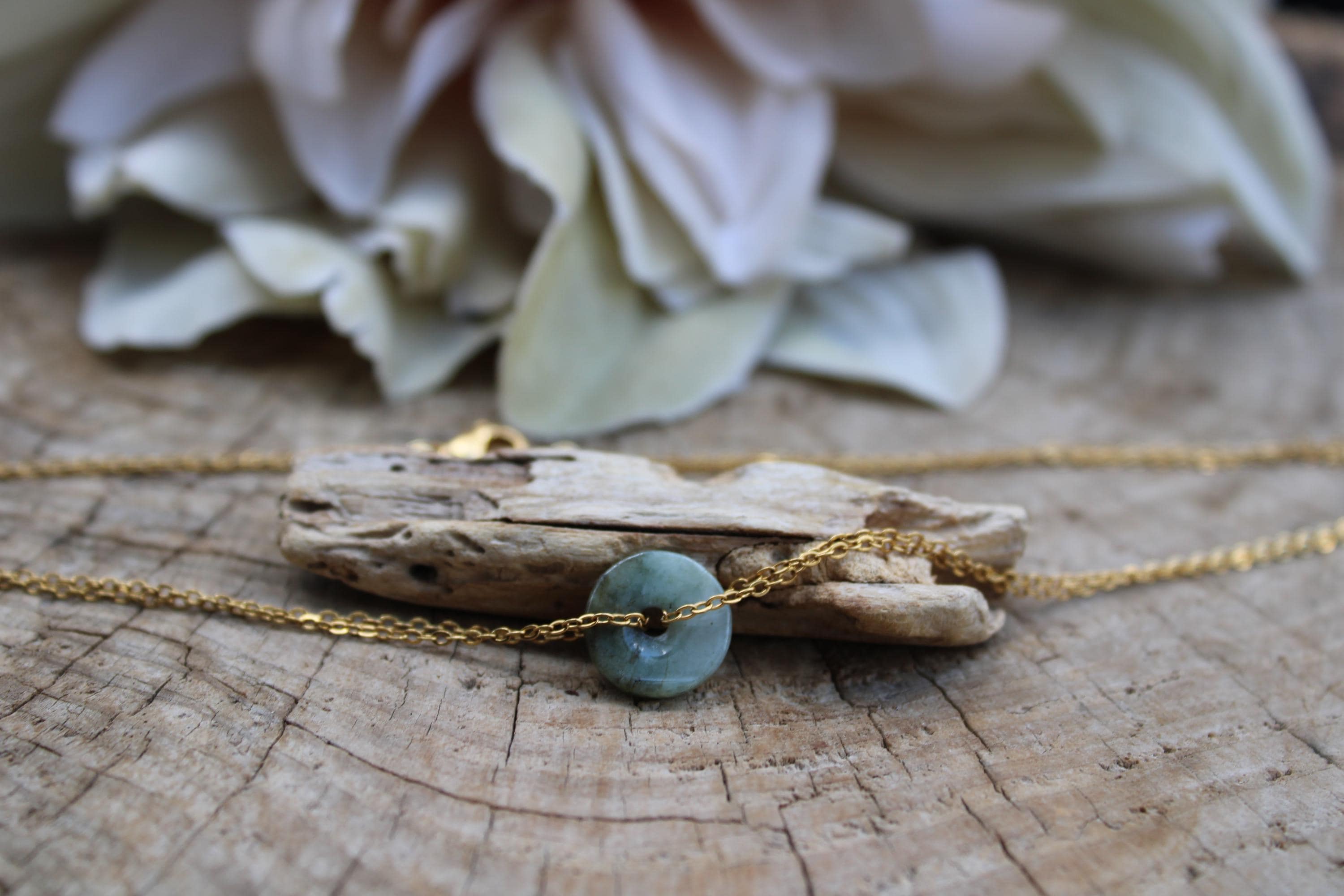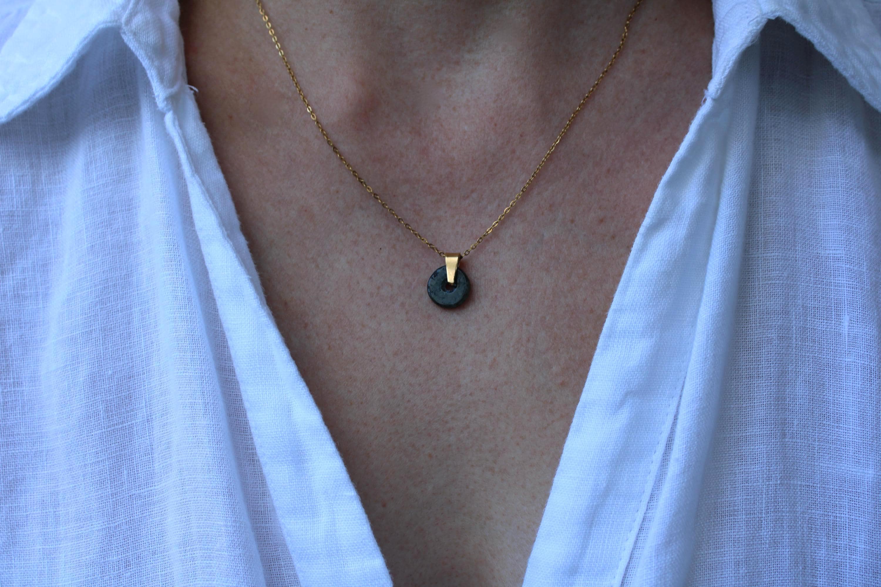 This necklace is features a genuine Burmese jade donut that is associated with good luck and prosperity. Personalise it by choosing the jade colour and chain of your choice.