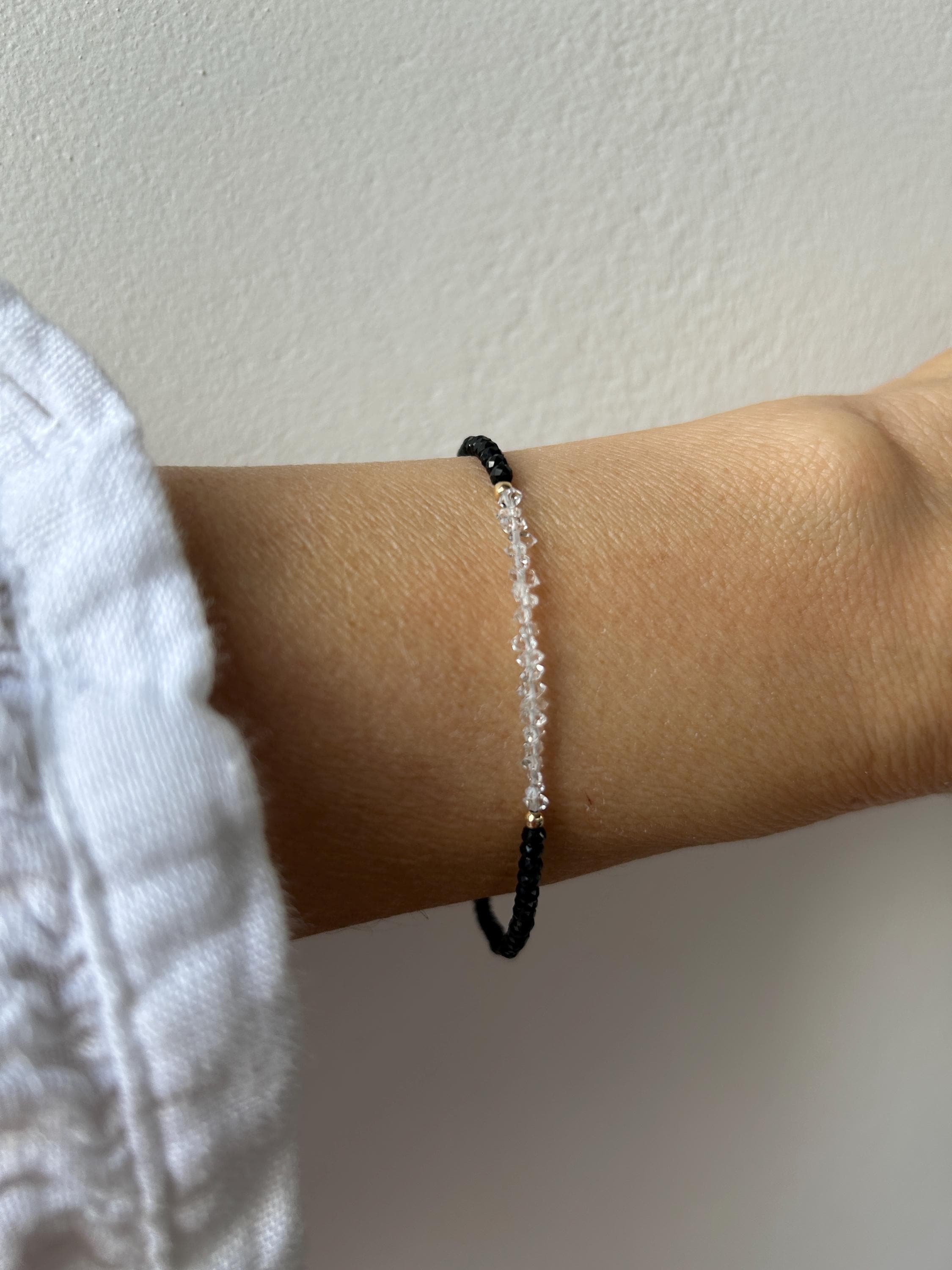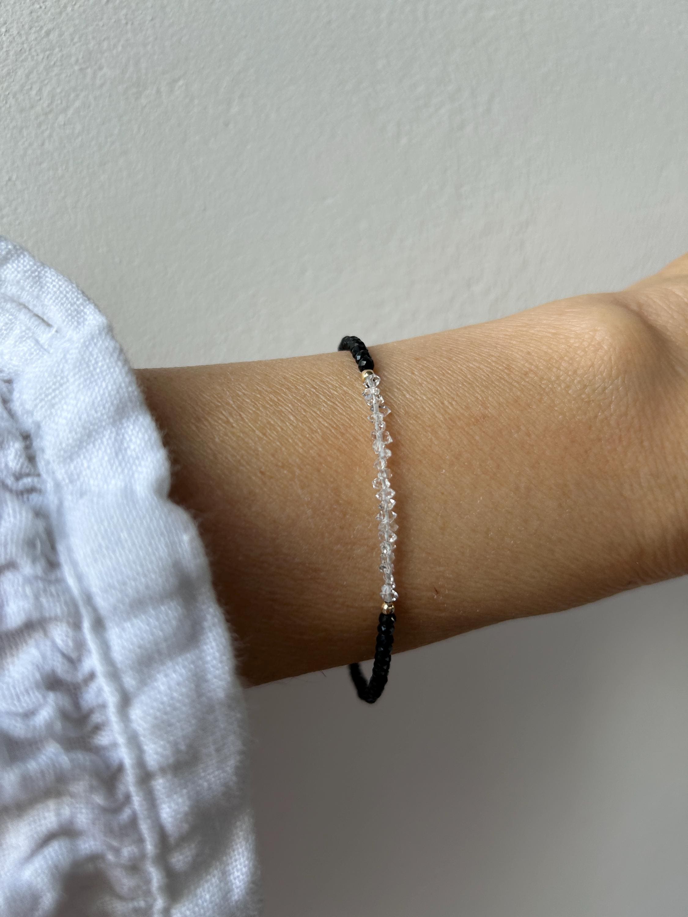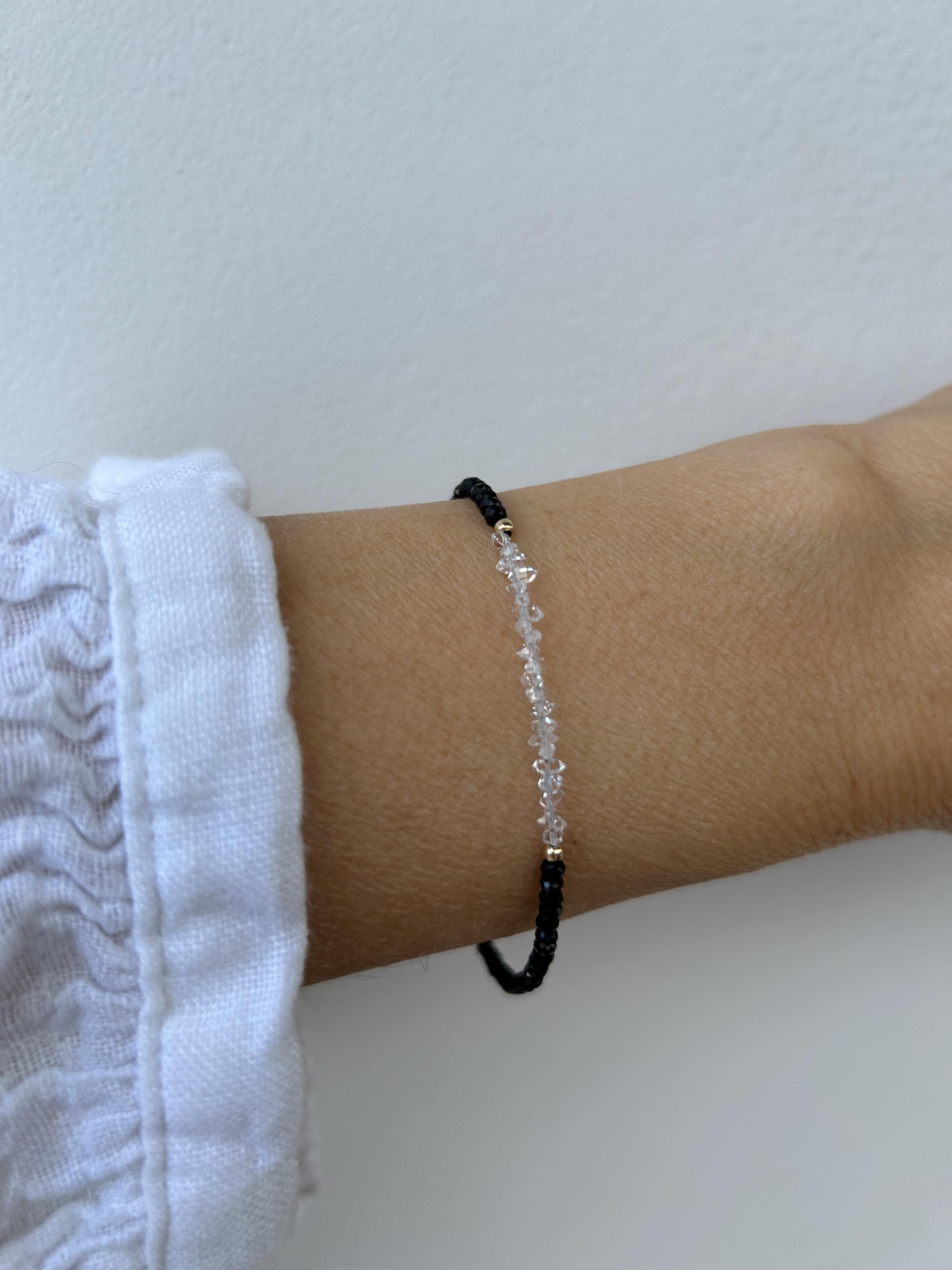 Black tourmaline which is also a powerful protection stone has been combined with beautiful herkimer diamonds that are associated with spiritual awareness.