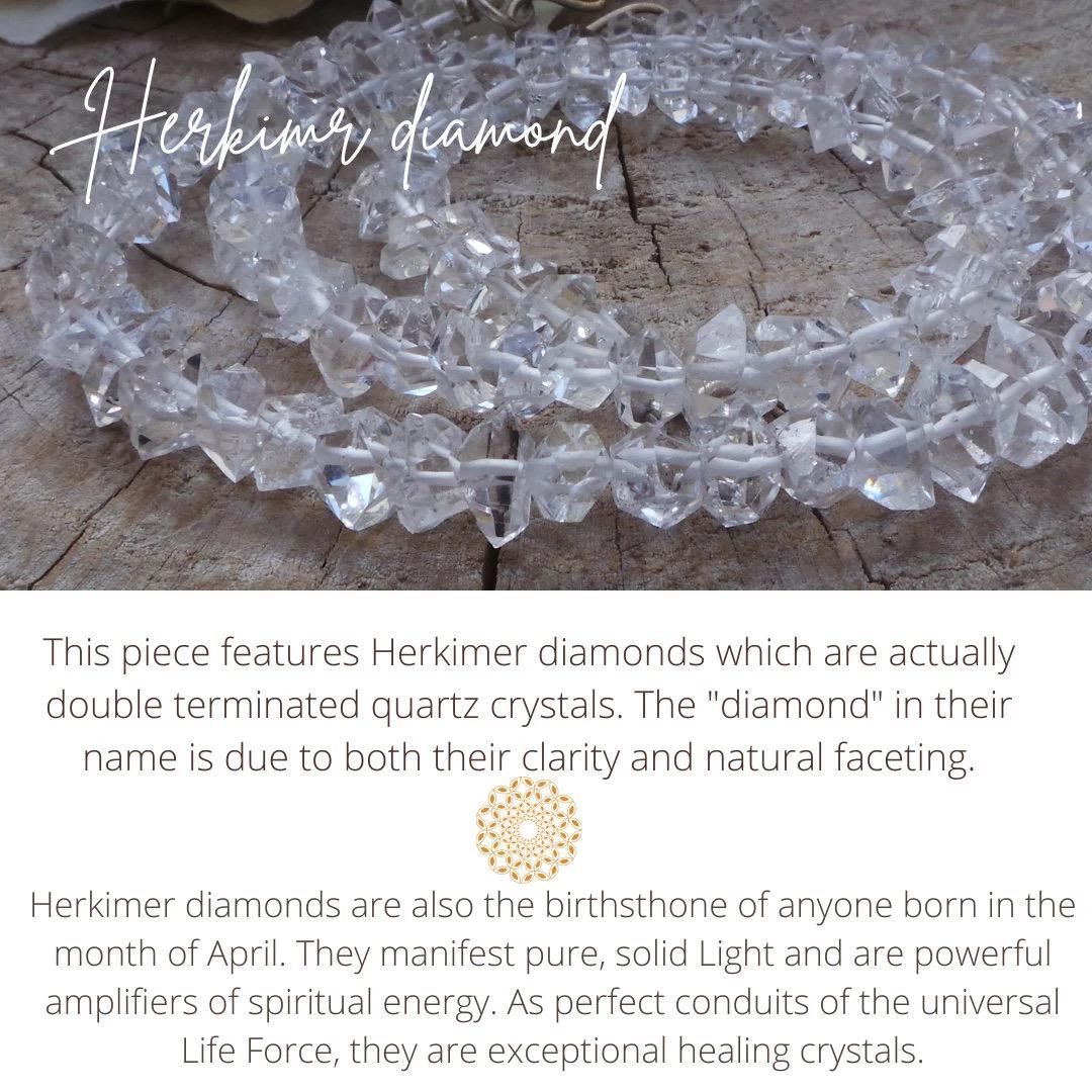 •The focal point is a bar tiny herkimer diamonds. Herkimer diamonds are actually double terminated quartz crystals. The "diamond" in their name is due to both their clarity and natural faceting.