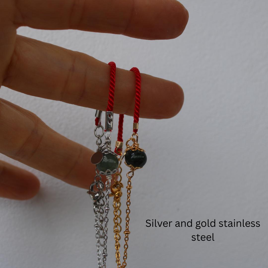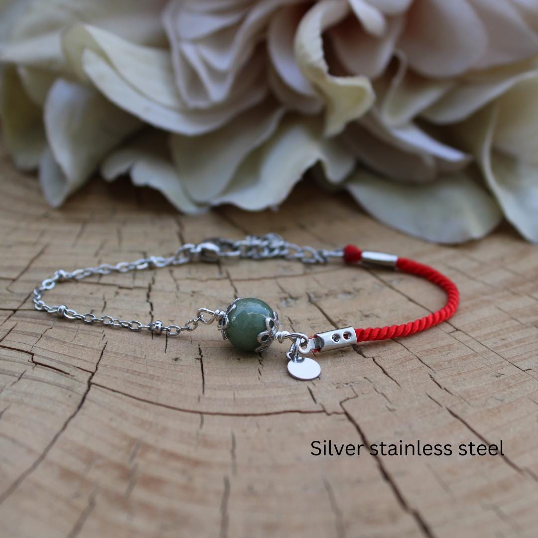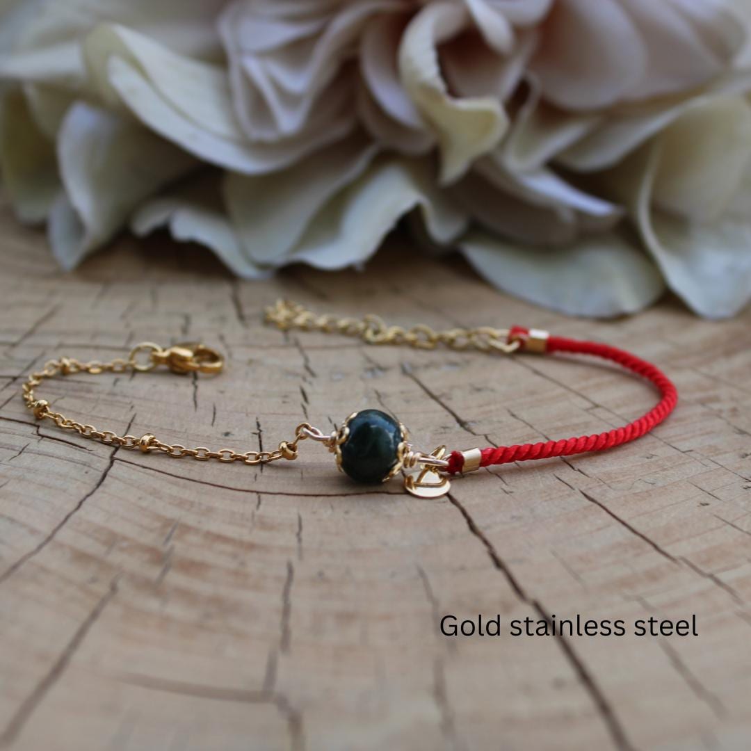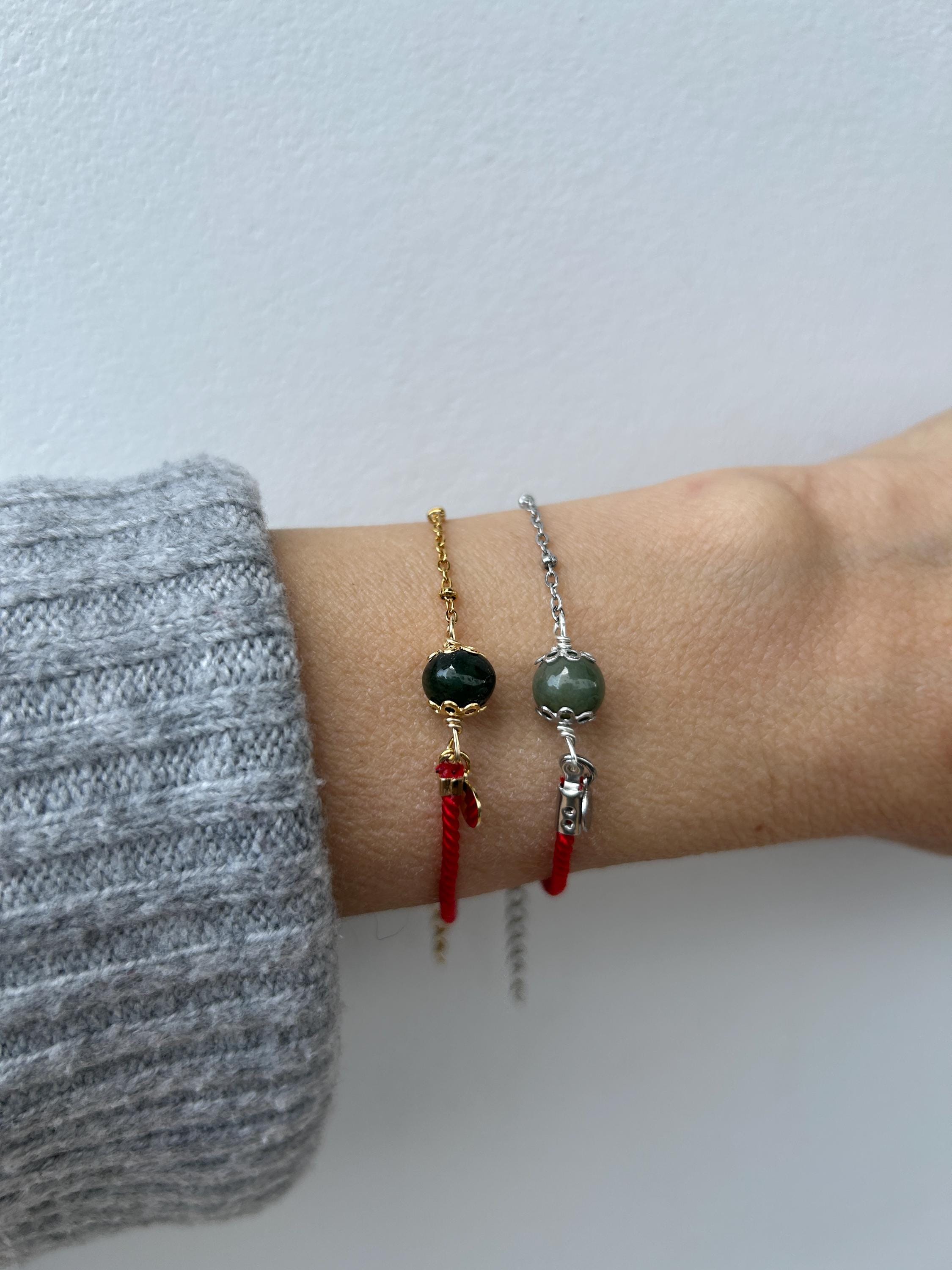 This bracelet combines green jade that is associated with abundance and prosperity and a red string for luck and protection.