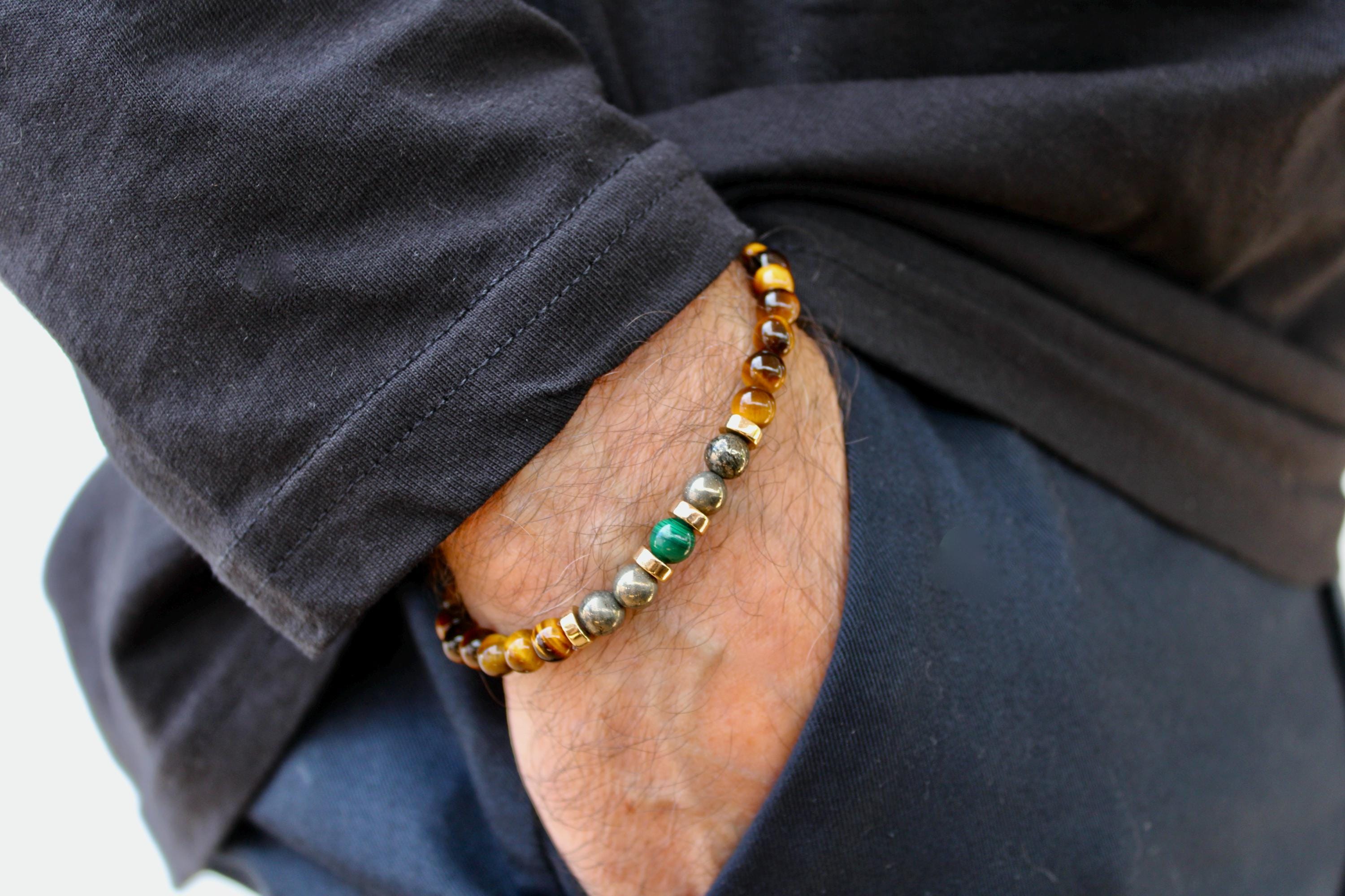 •Made with AAA quality tiger's eye gemstones, pyrite and malachite measuring 6mm and gold plated hematite accent beads