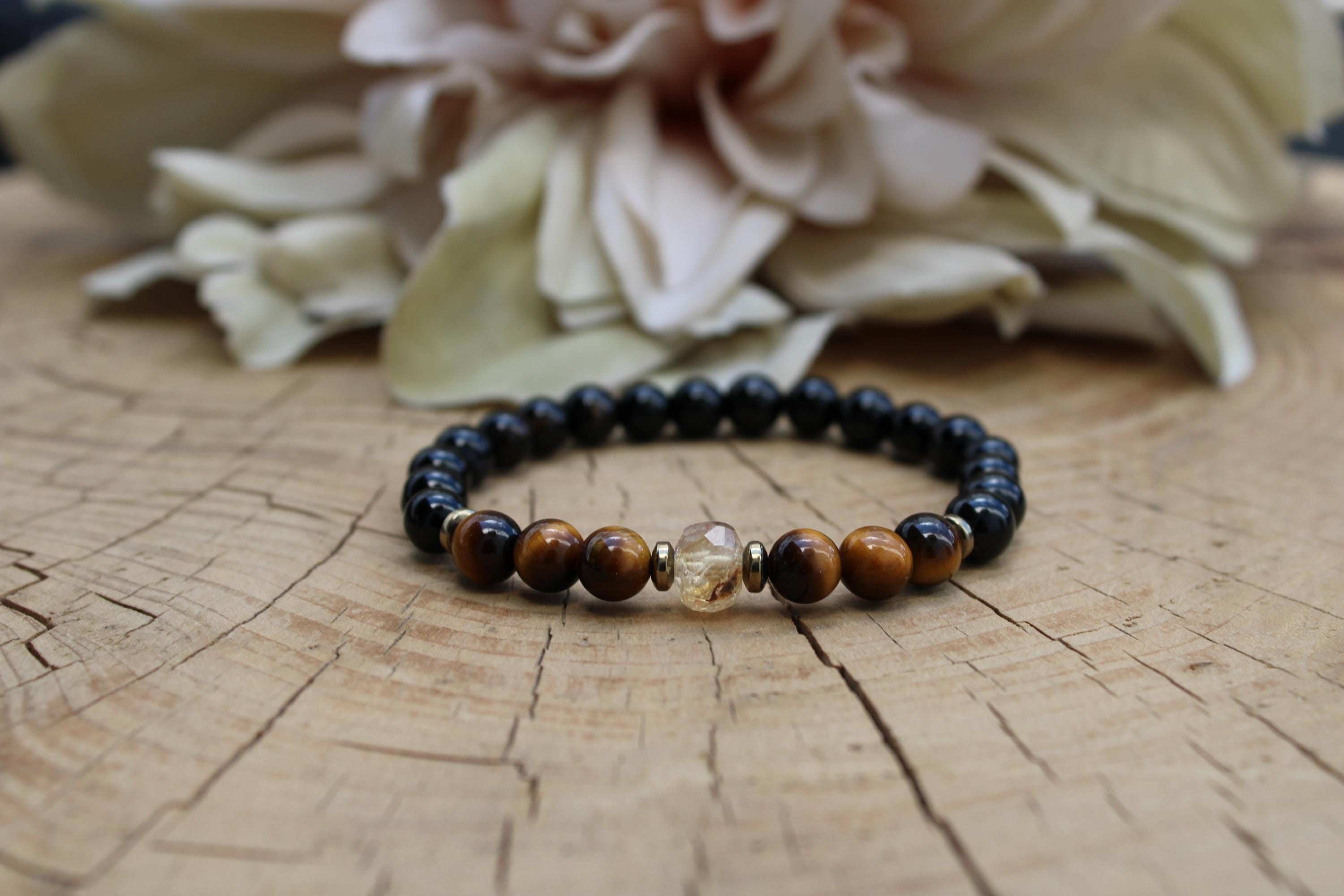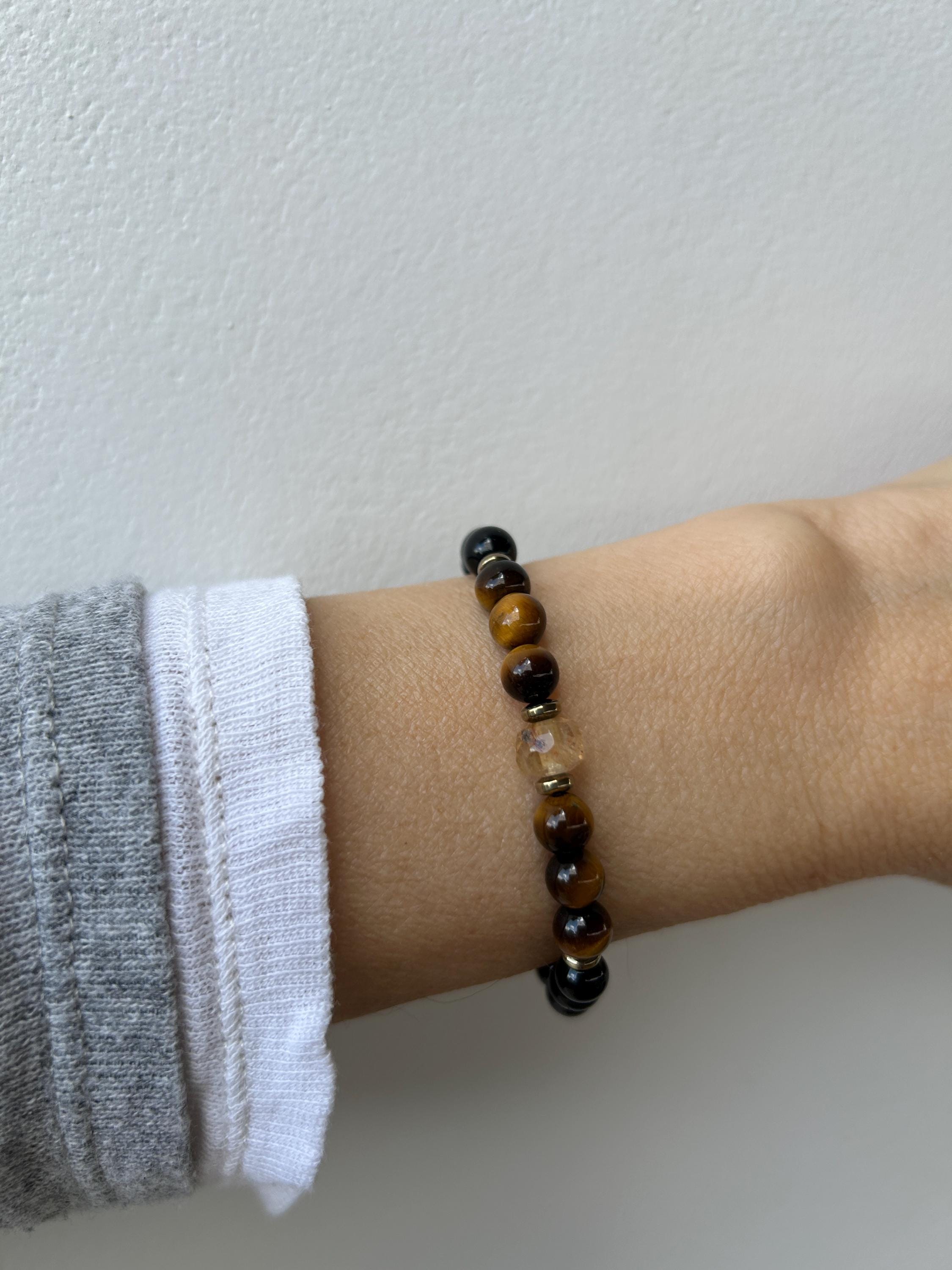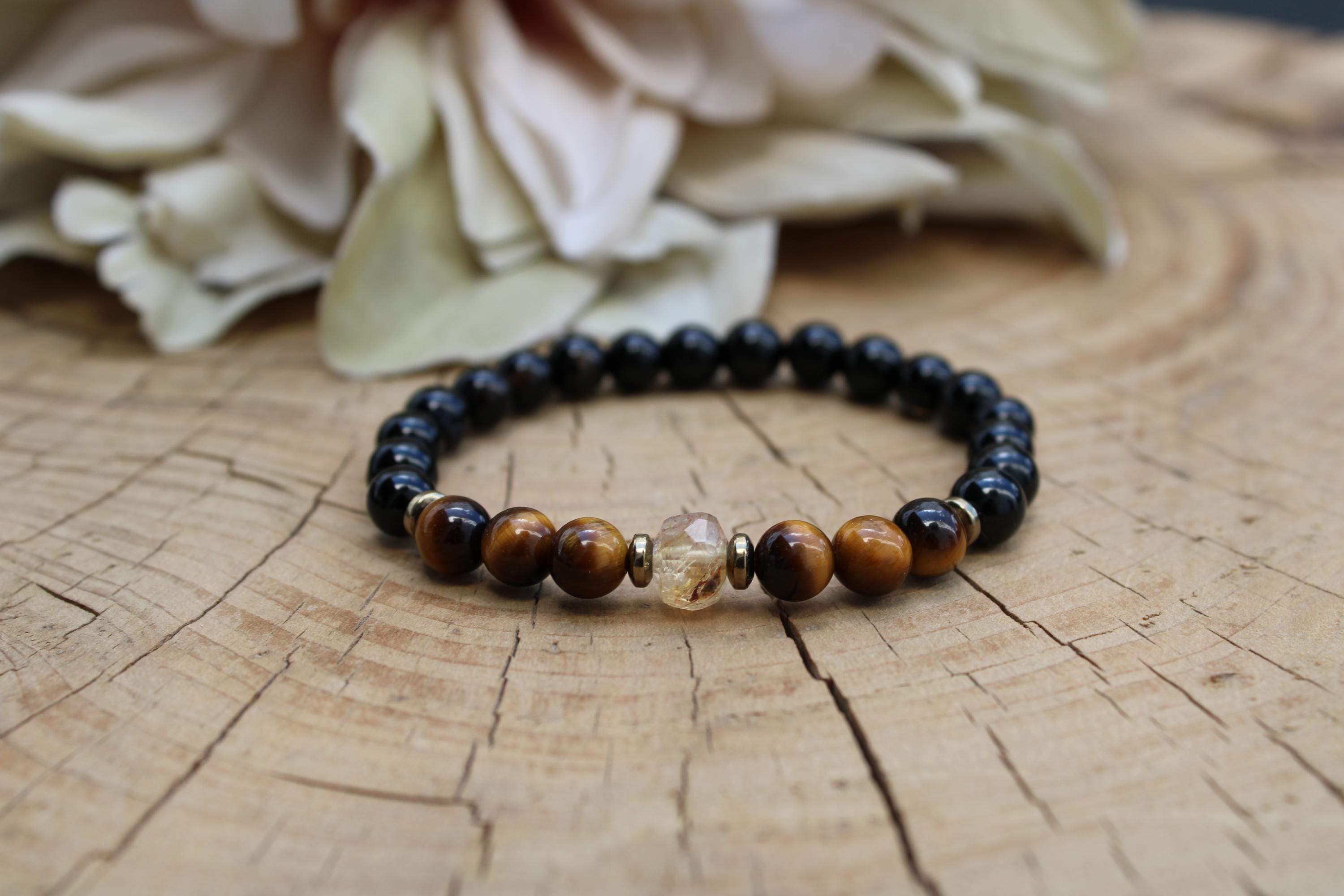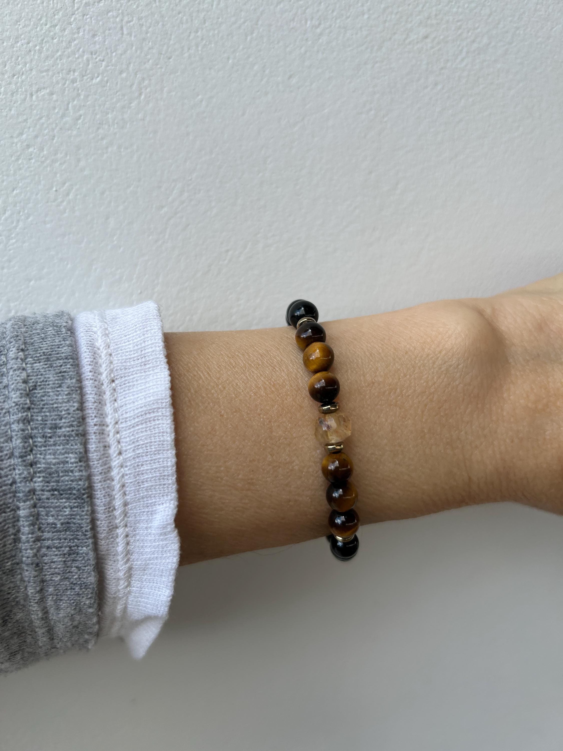 •It features 6mm black onyx, and polished tiger's eye . The focal point is a beautiful faceted citrine crystal measuring around 7mm. Each of these is unique.