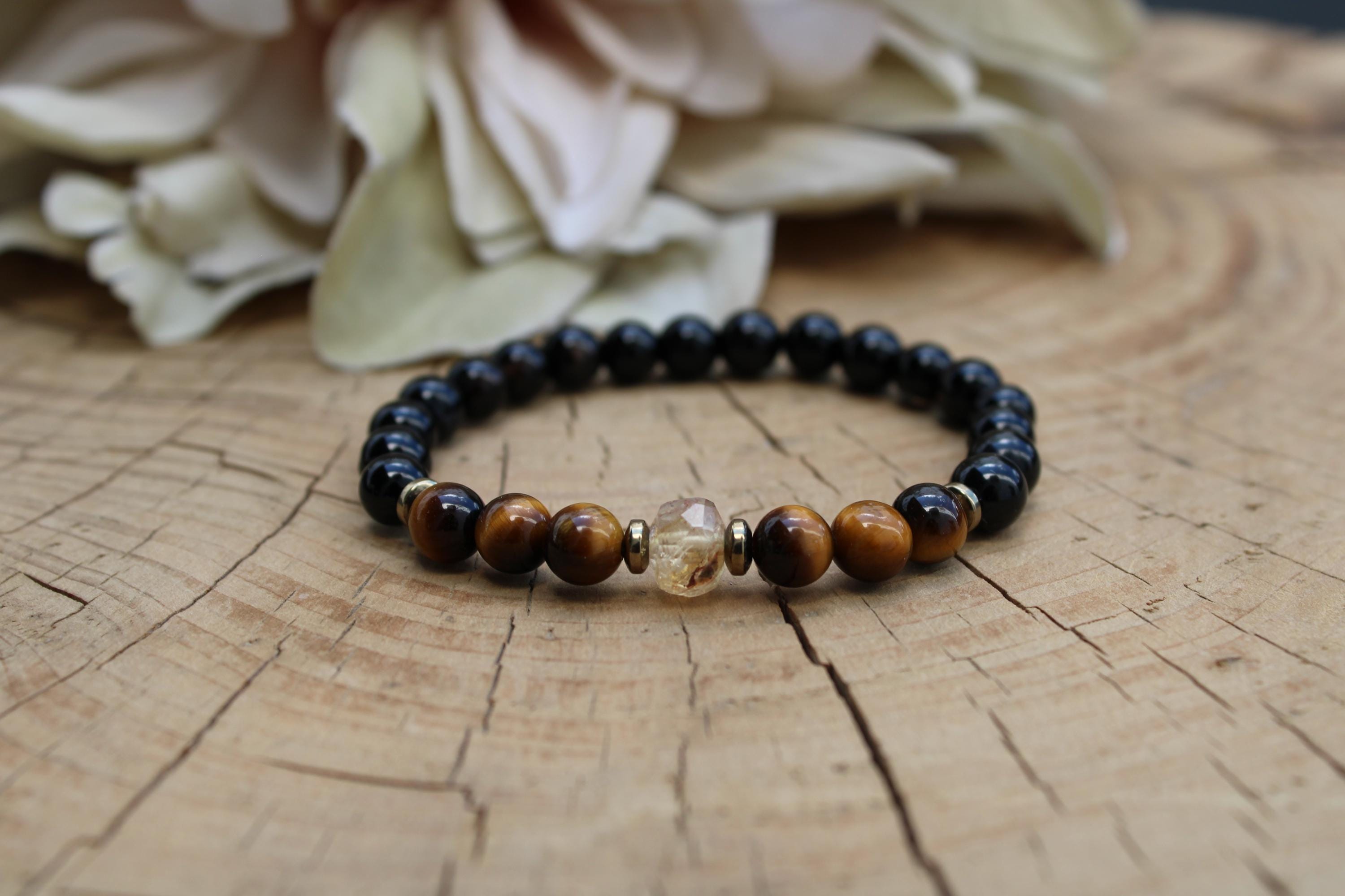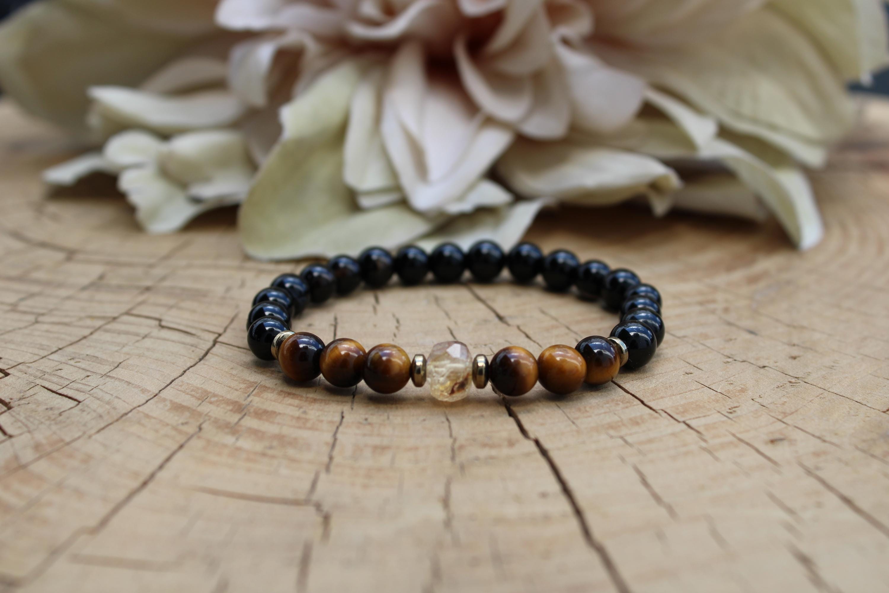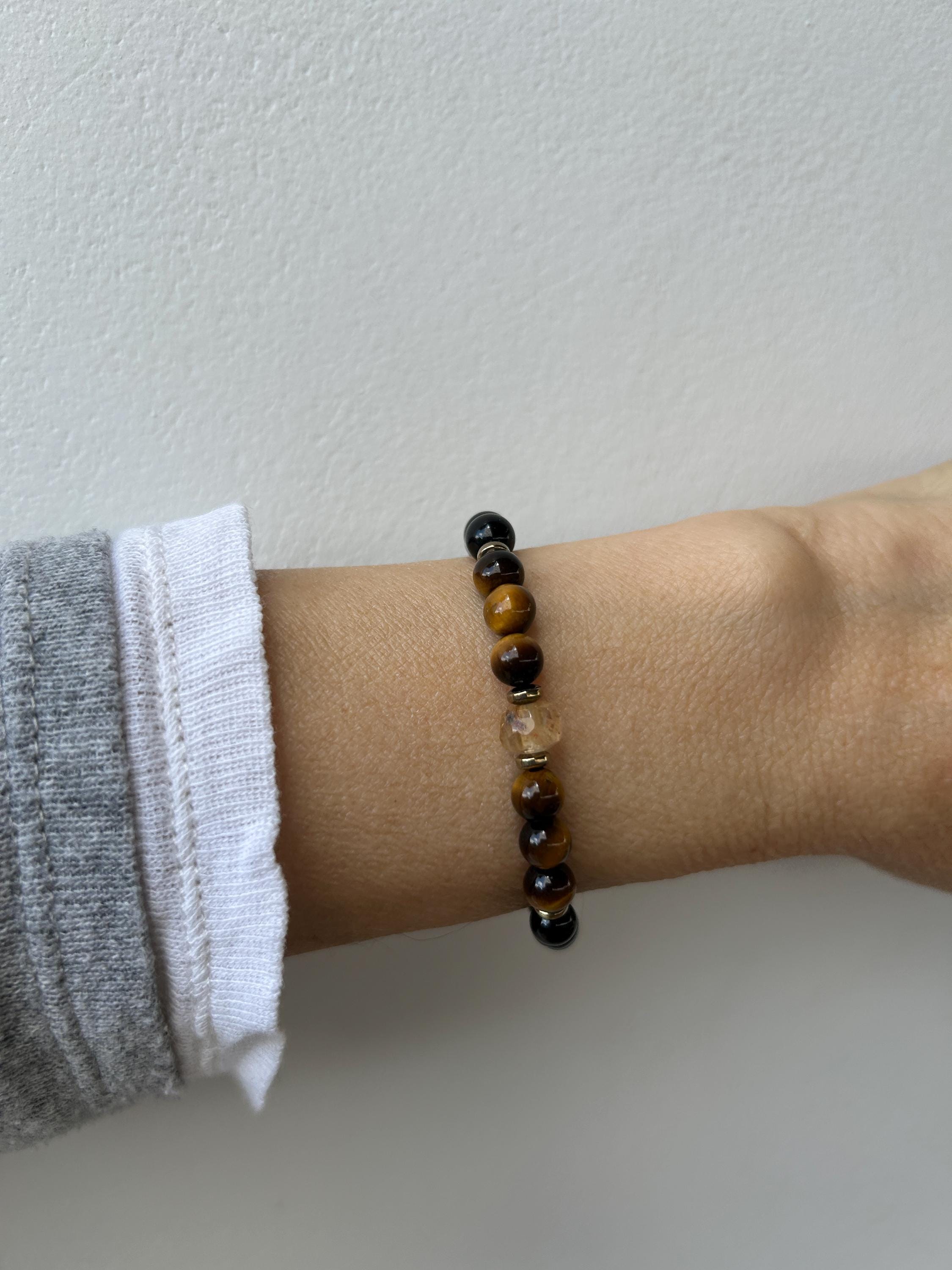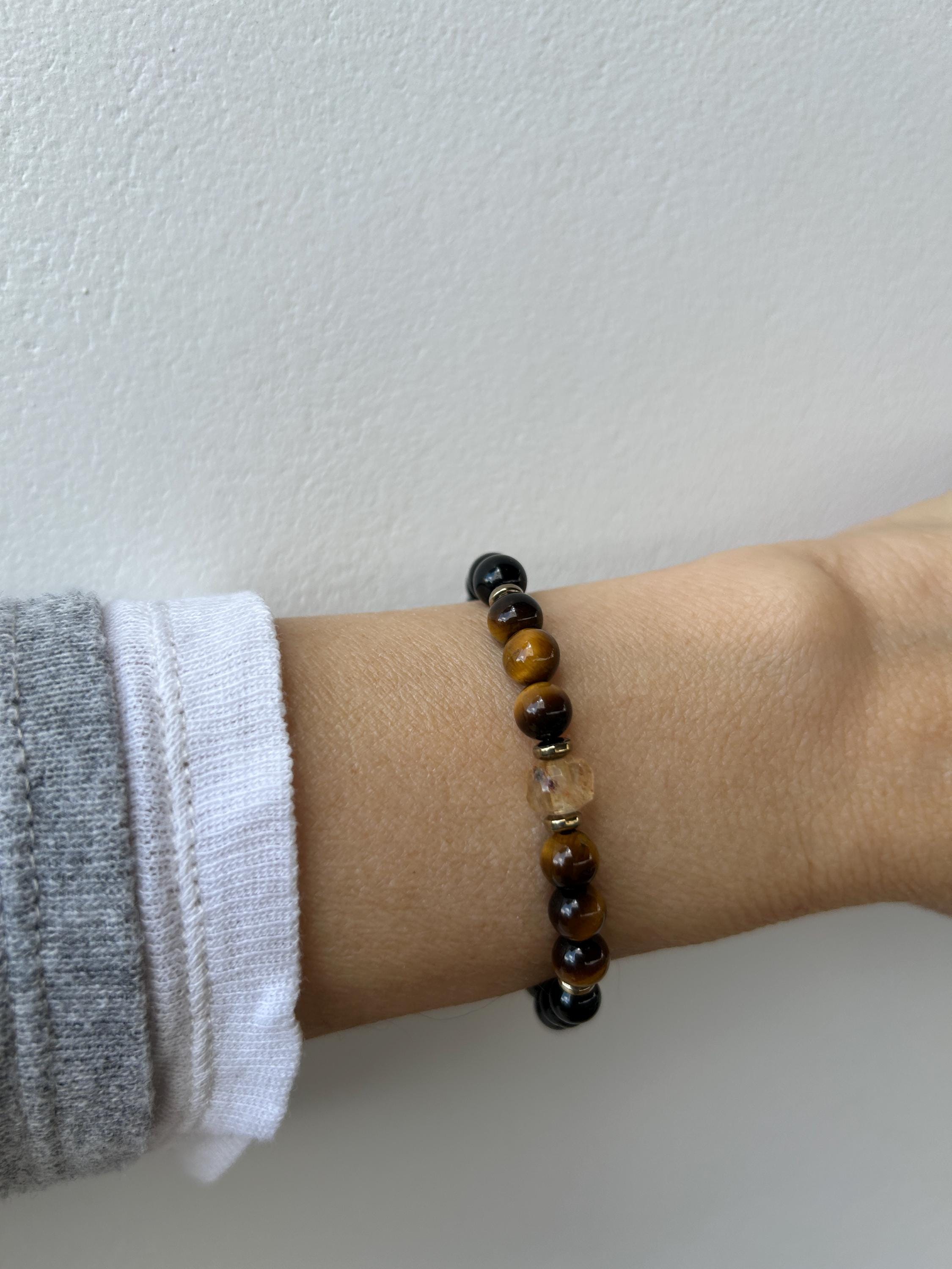 •It features 6mm black onyx, and polished tiger's eye . The focal point is a beautiful faceted citrine crystal measuring around 7mm. Each of these is unique.