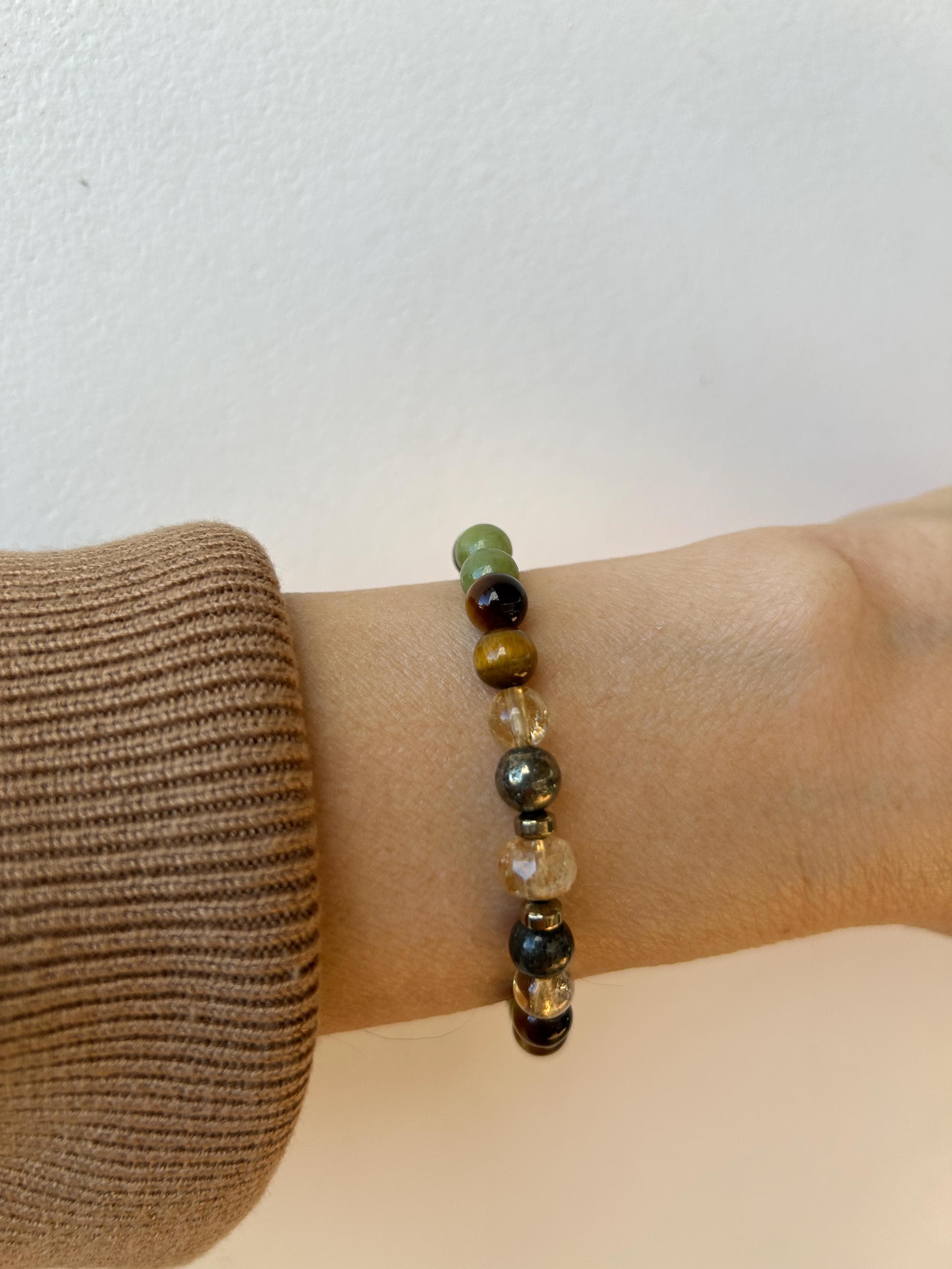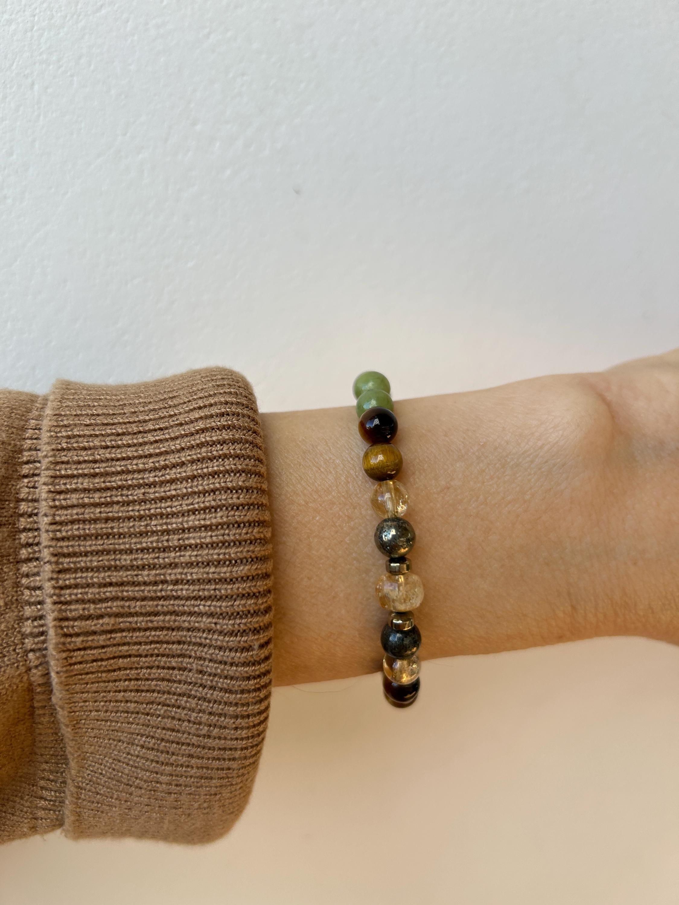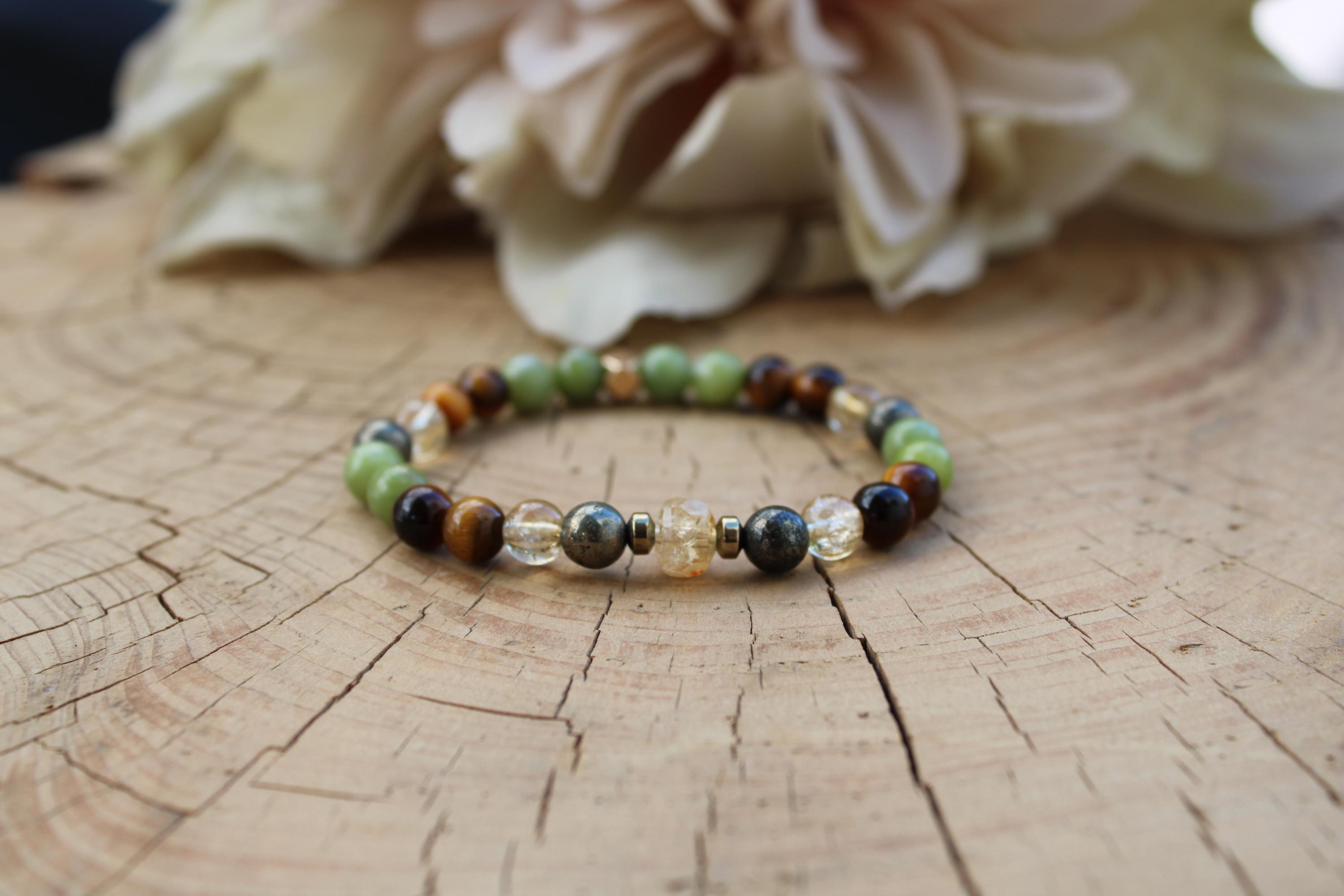 This unisex bracelet combines gemstones that are associated with prosperity, abundance, protection and attracting wealth and luck.