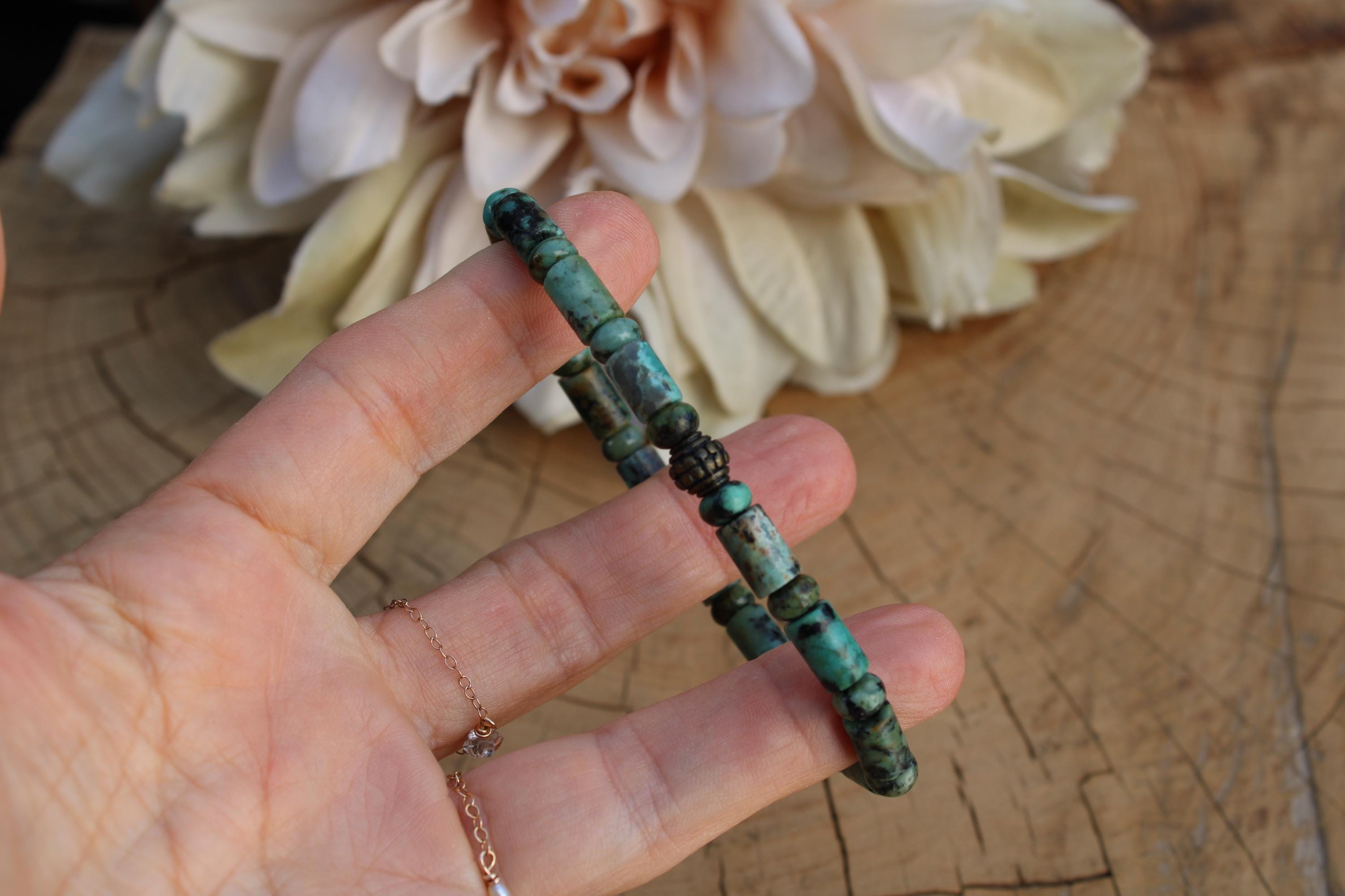 •Made with natural African turquoise gemstones in varying shapes. These measure 9~9.5x6mm and 6~6.5x4mm.