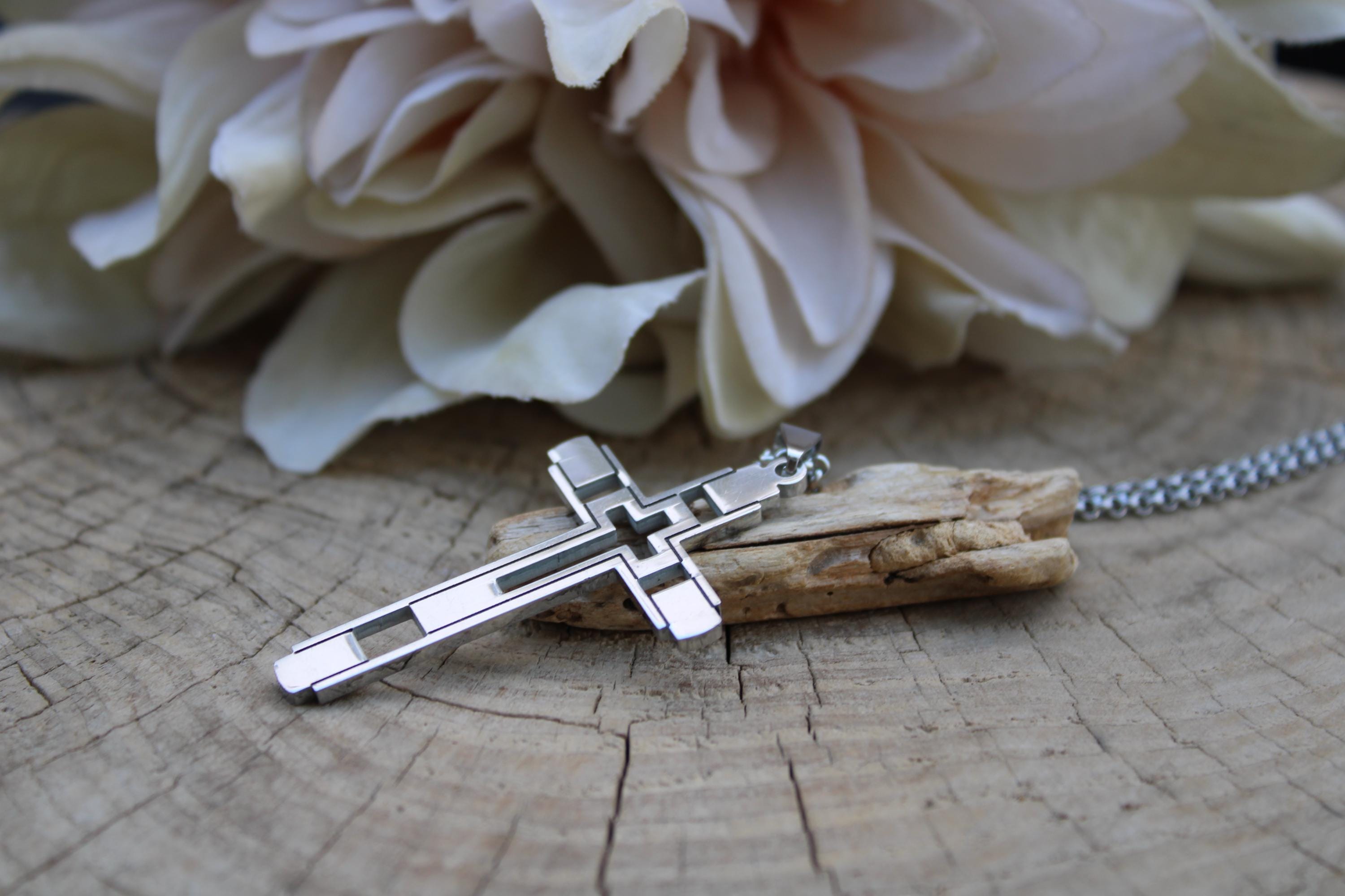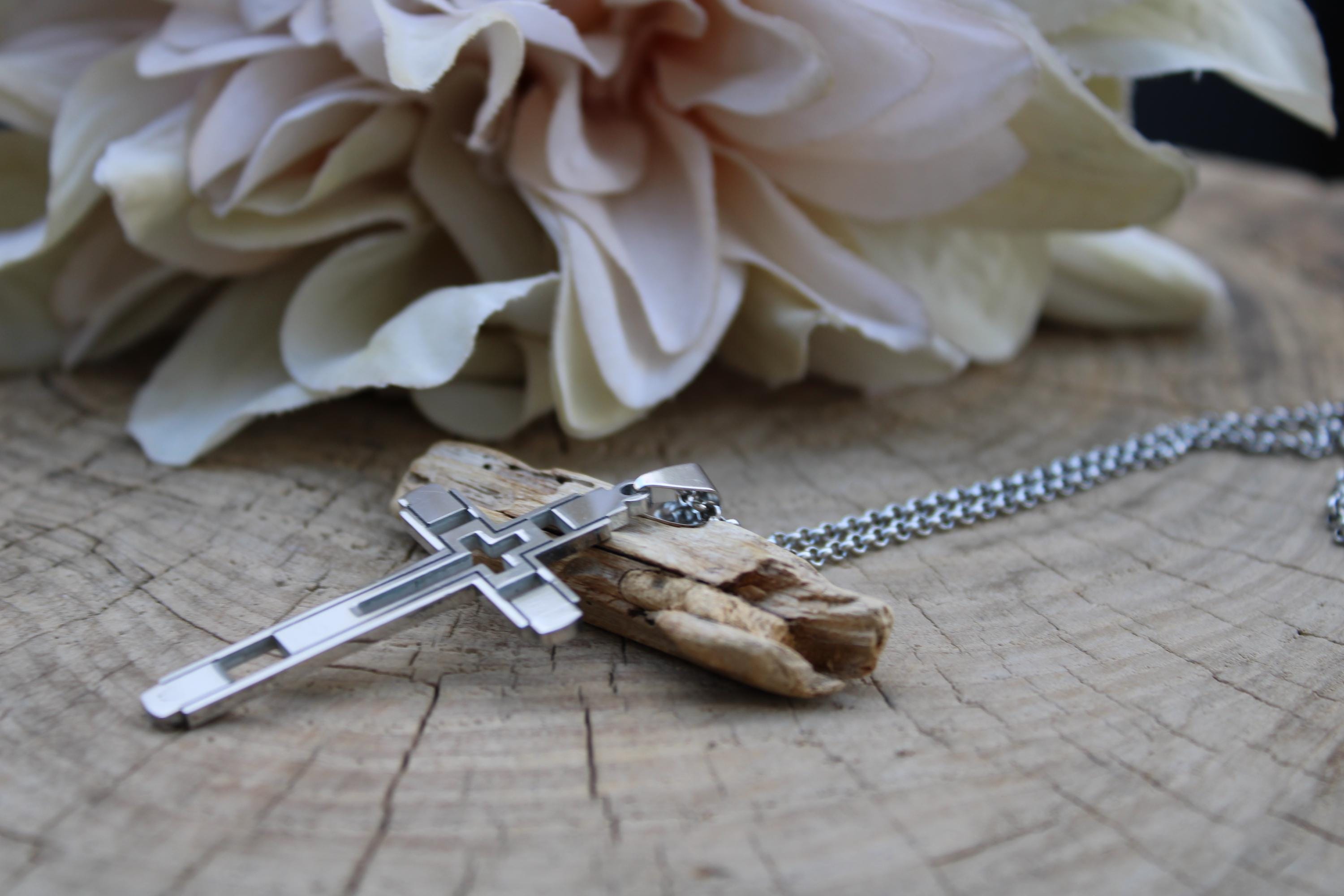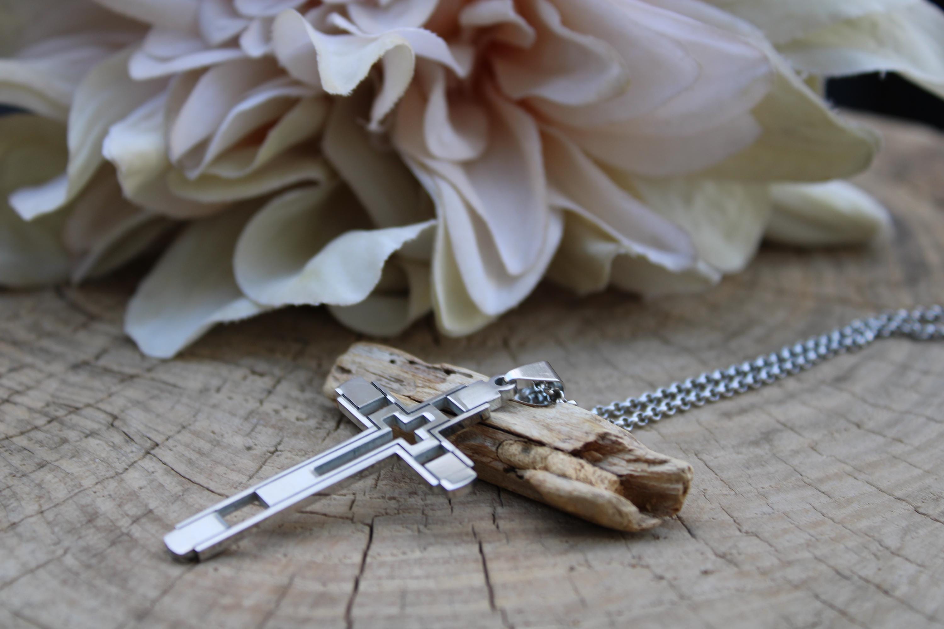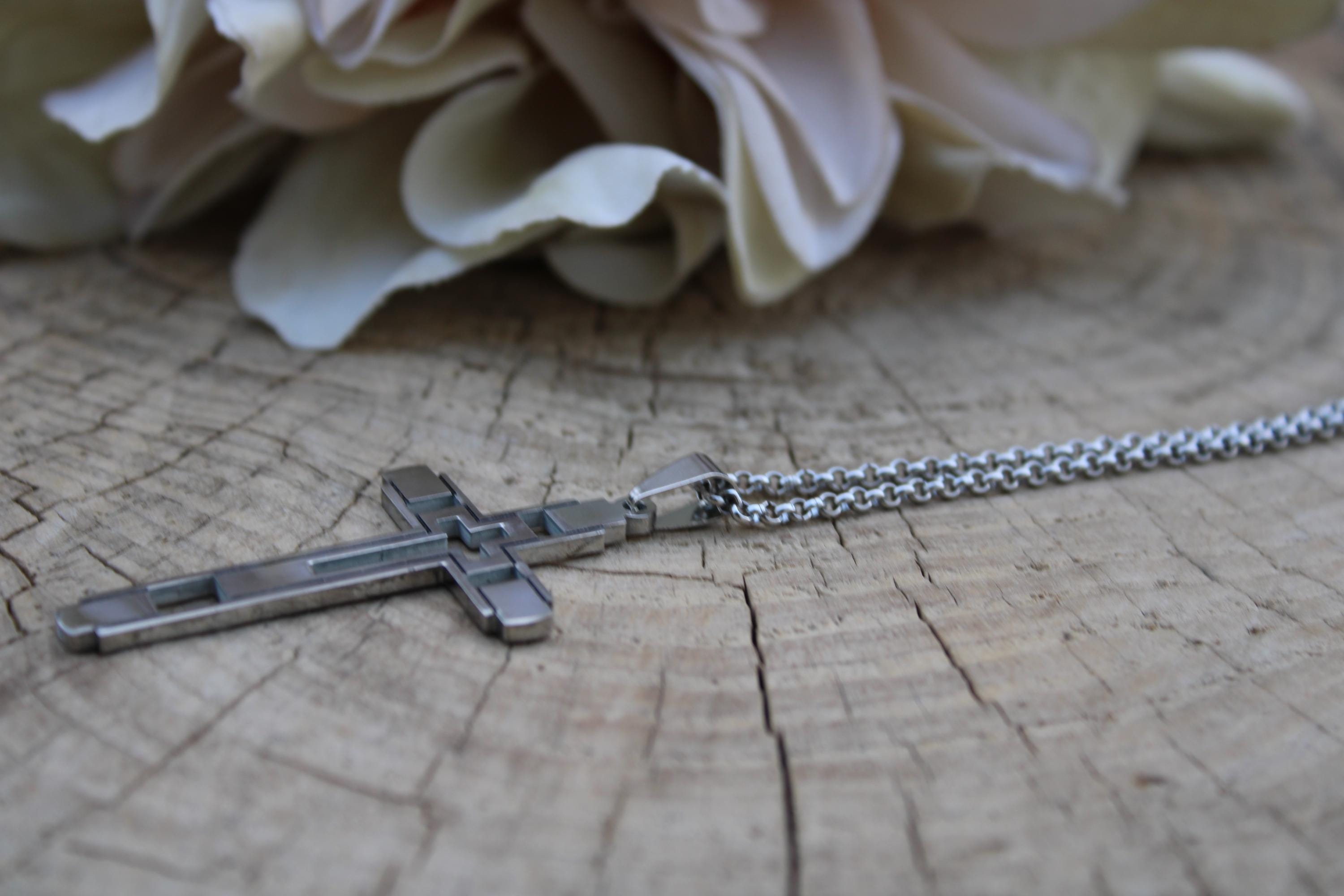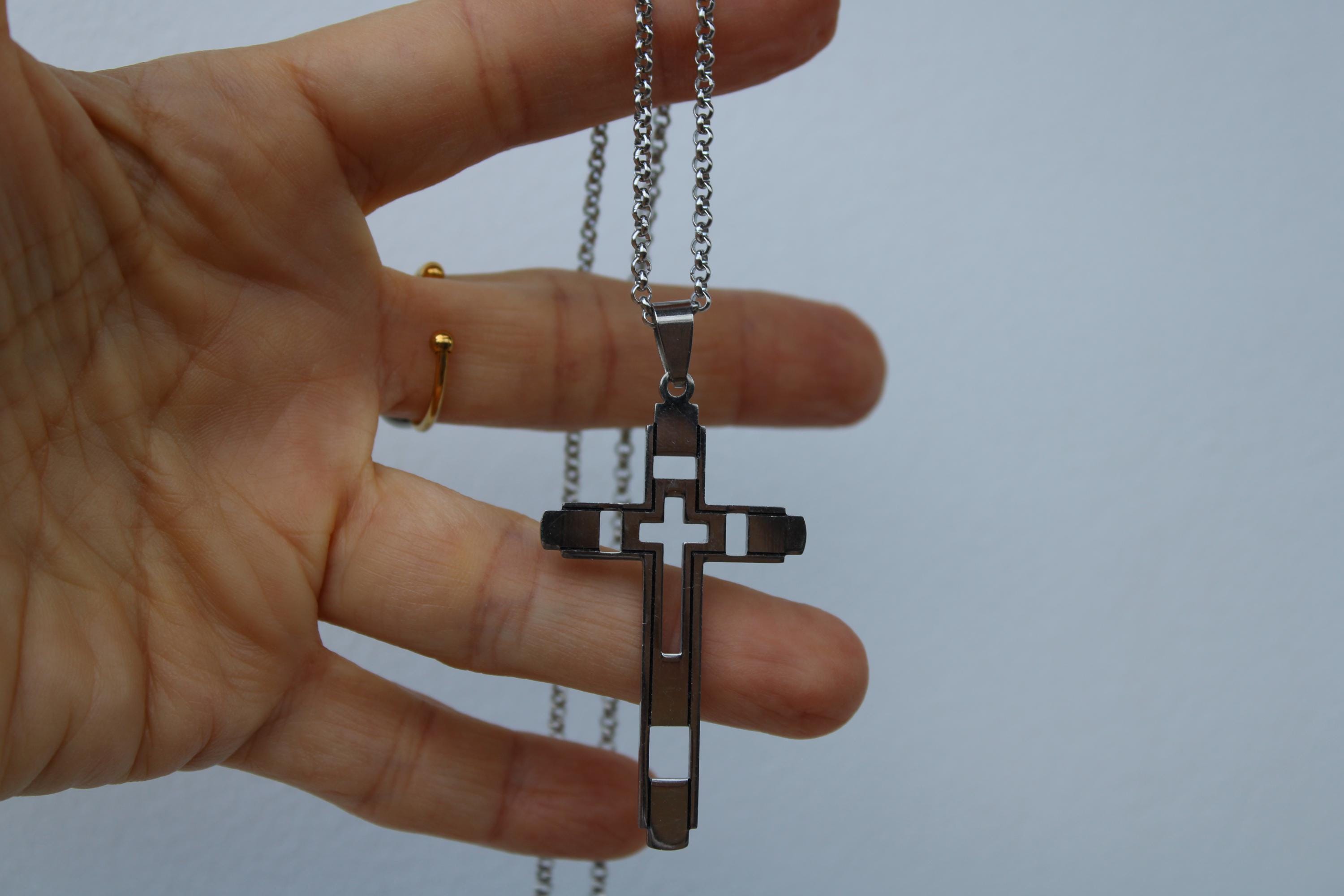 •This design features a large stainless steel cross pendant. Pendant measures 5.2 x 3.3cm.