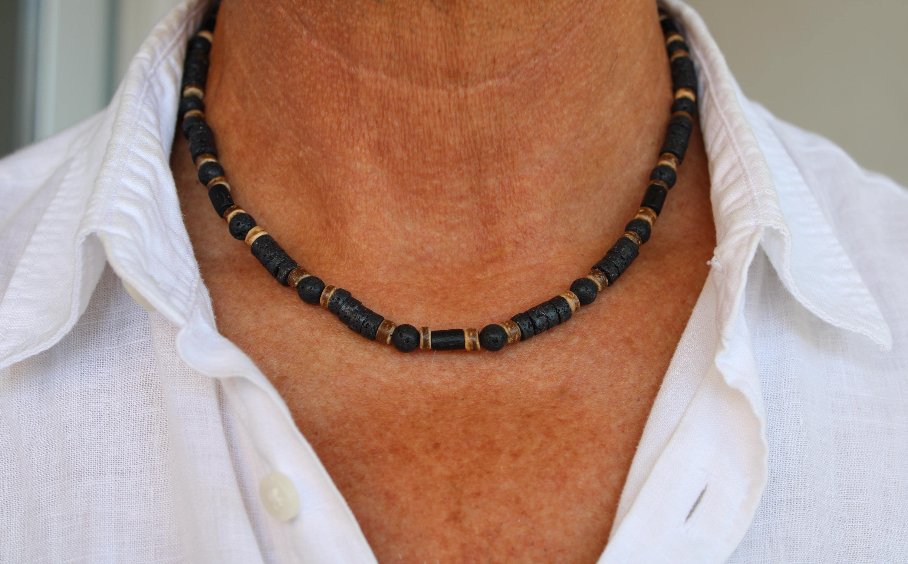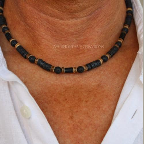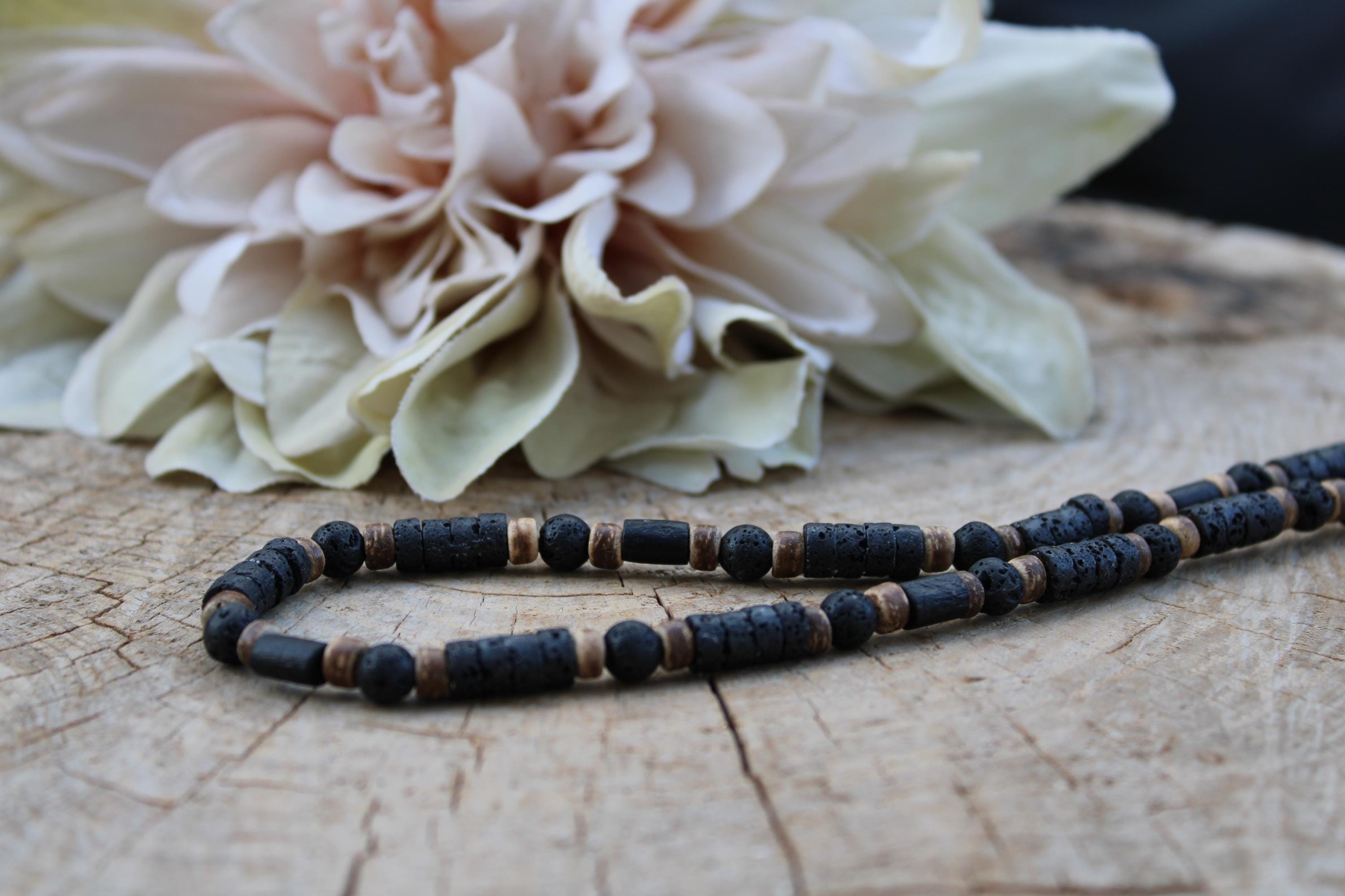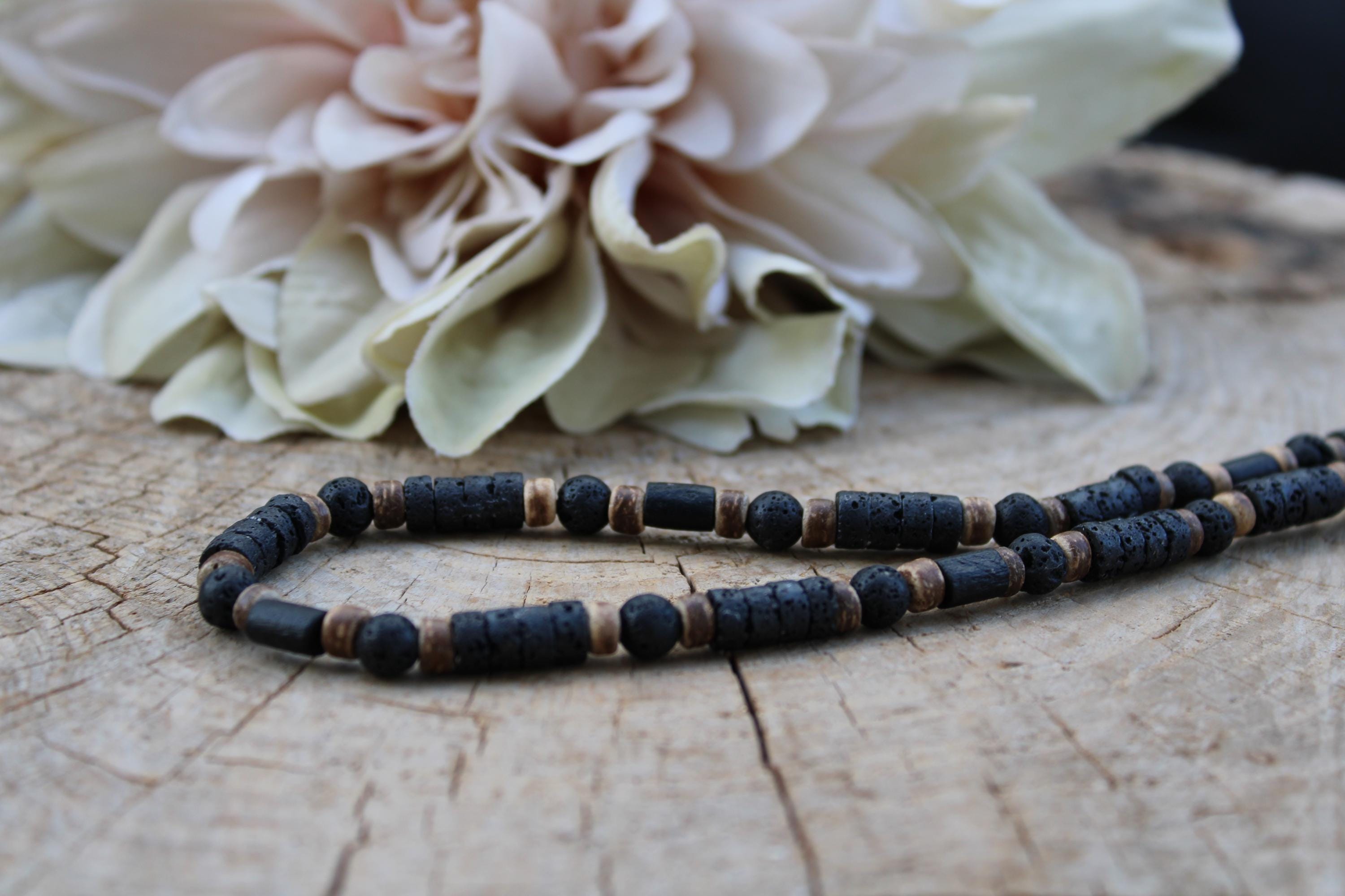 •Made with 6mm lava rock heishi beads, 6mm round lava gemstones and 5mm natural coconut and black wood column beads.