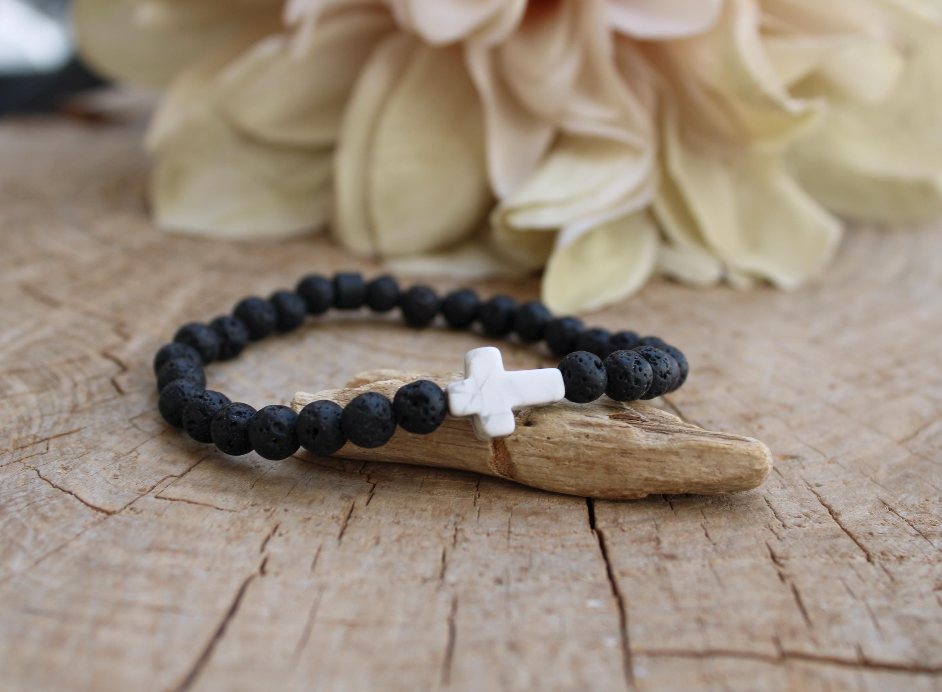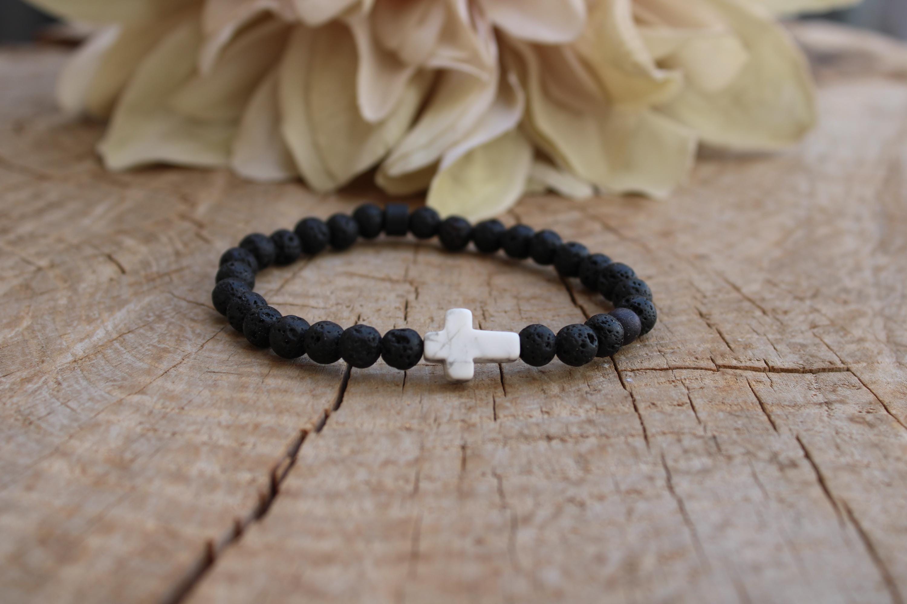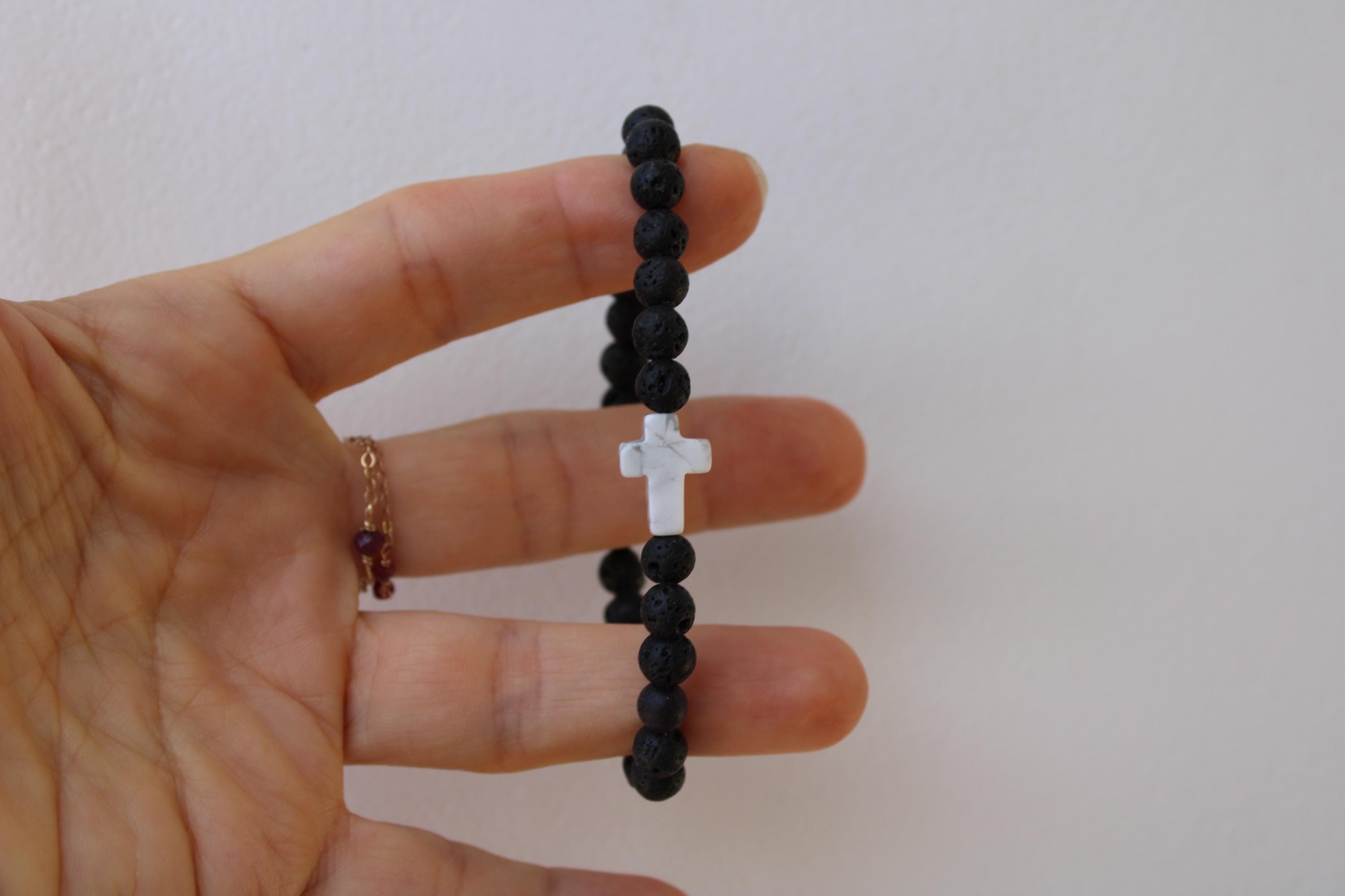This simple beaded cross bracelet will make a great addition to your wrist game. It features lava rock and howlite which are associated with protection, grounding and soothing properties.