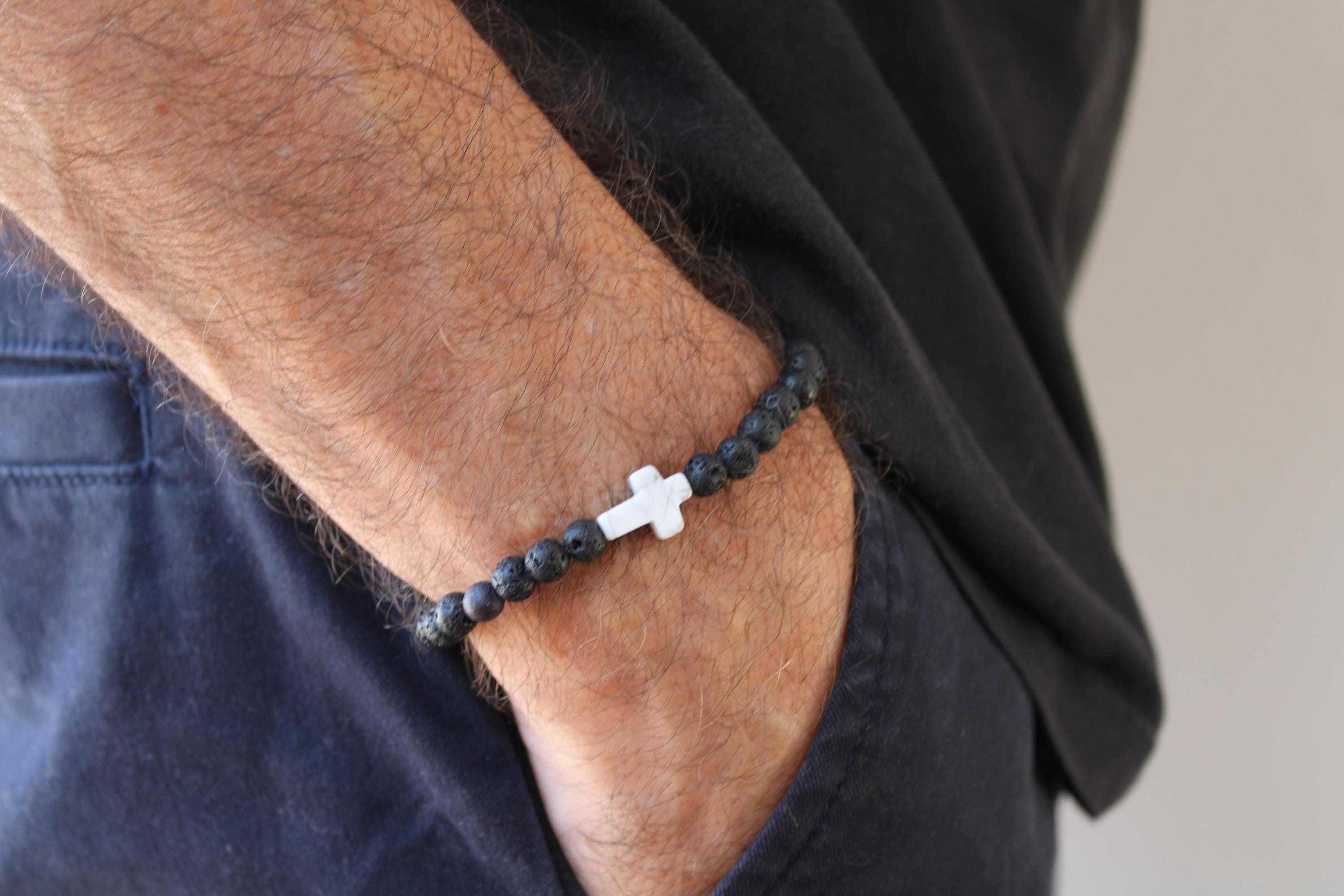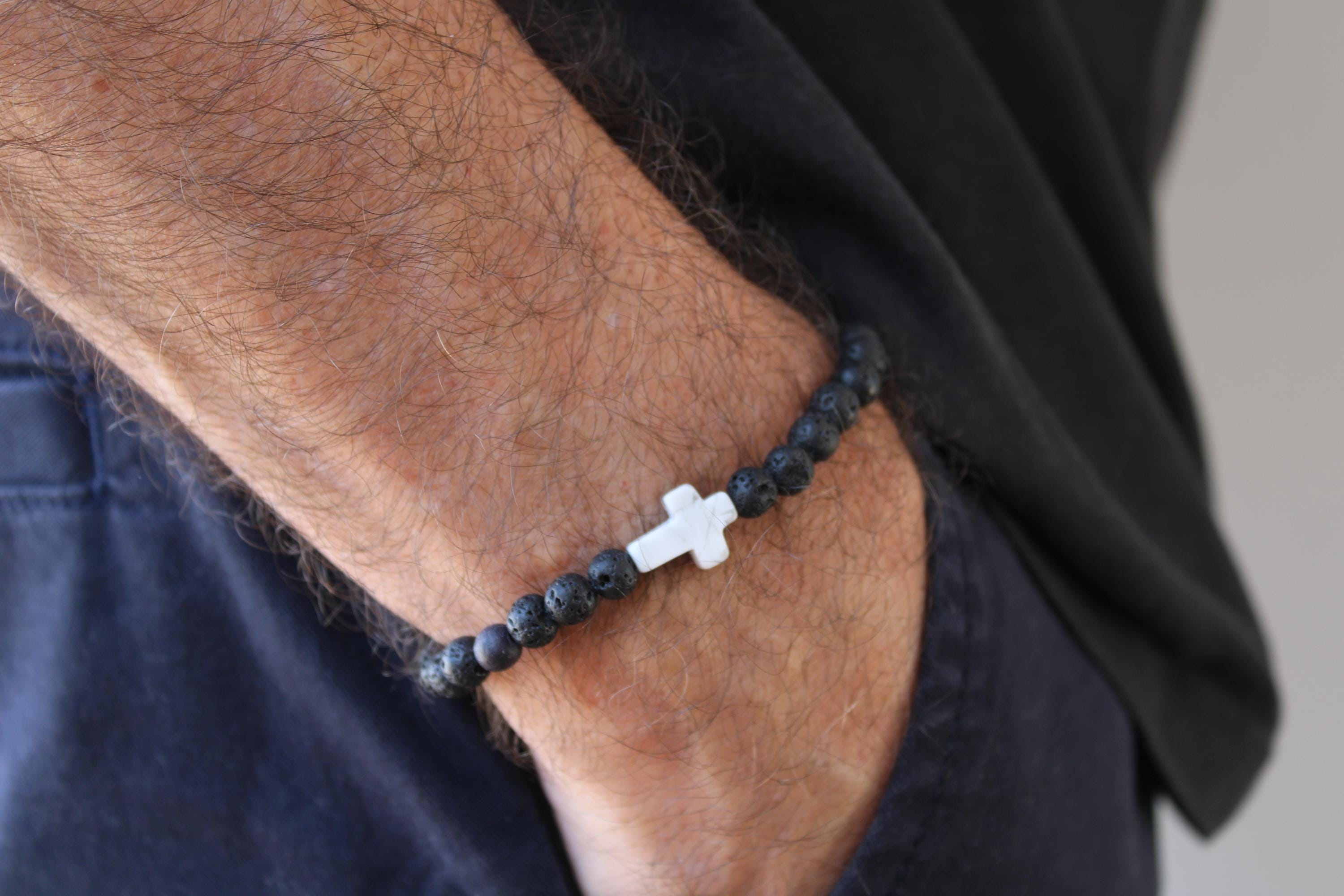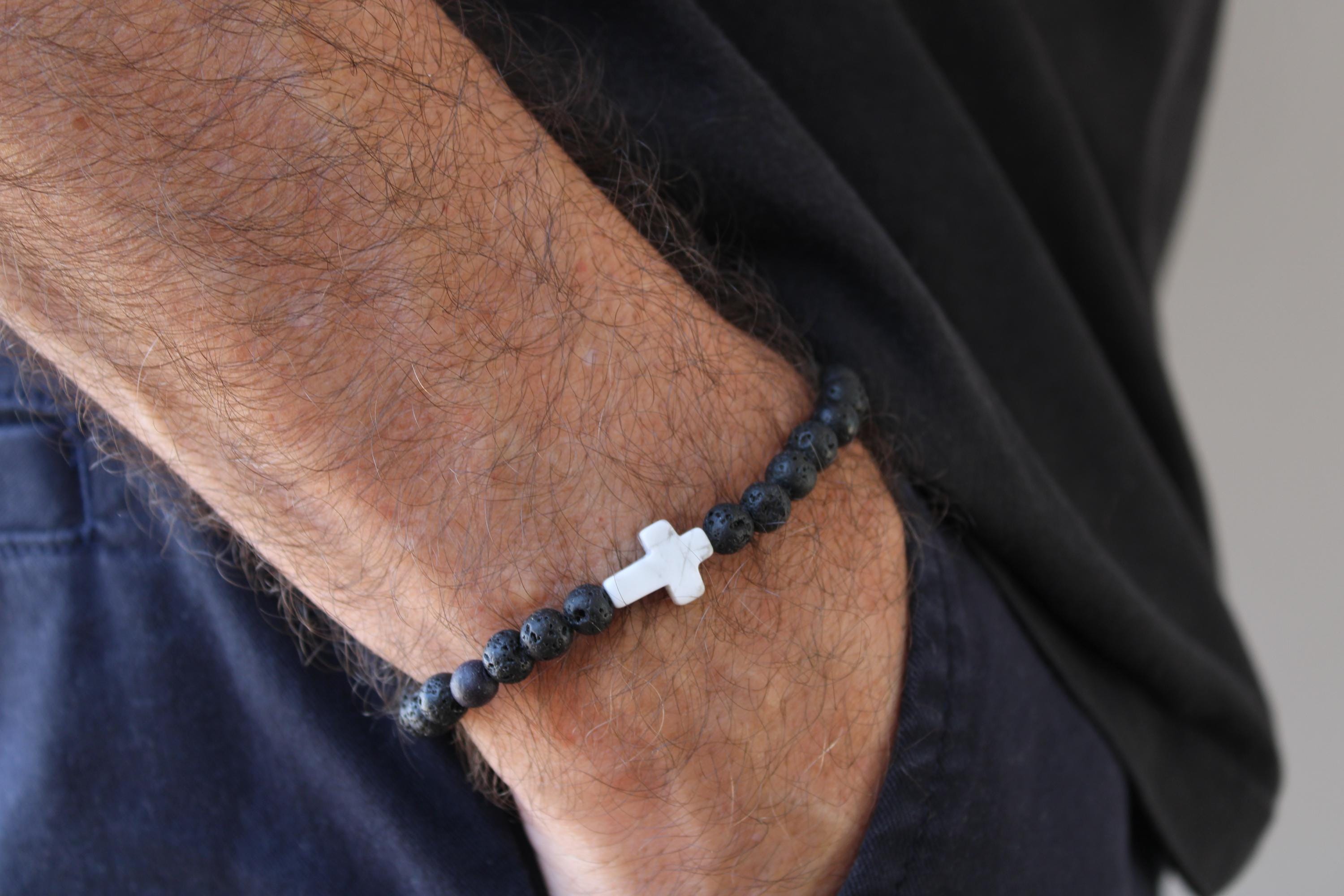 This simple beaded cross bracelet will make a great addition to your wrist game. It features lava rock and howlite which are associated with protection, grounding and soothing properties.