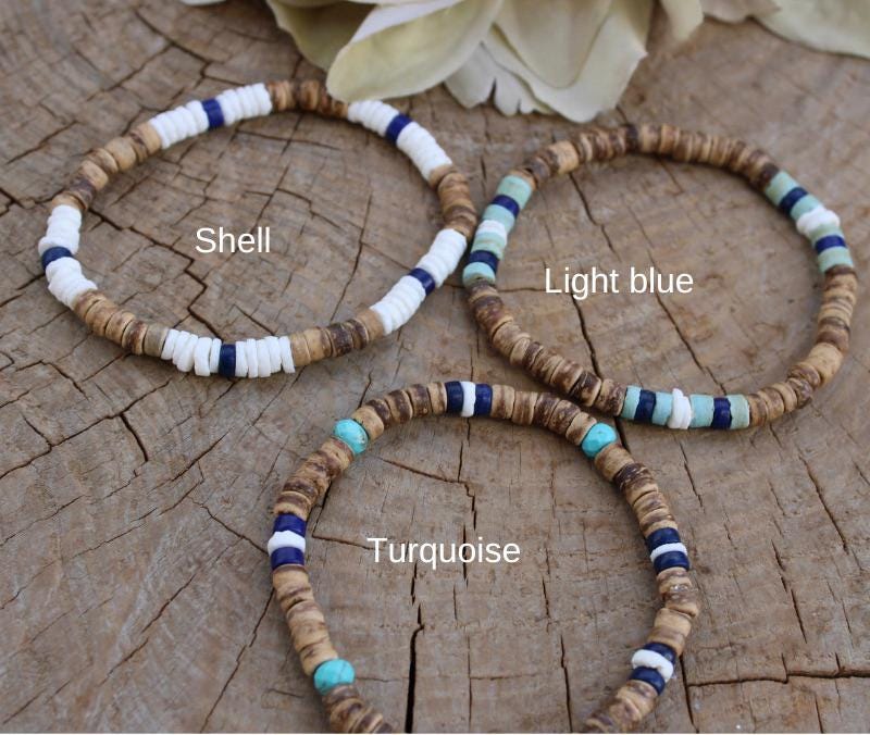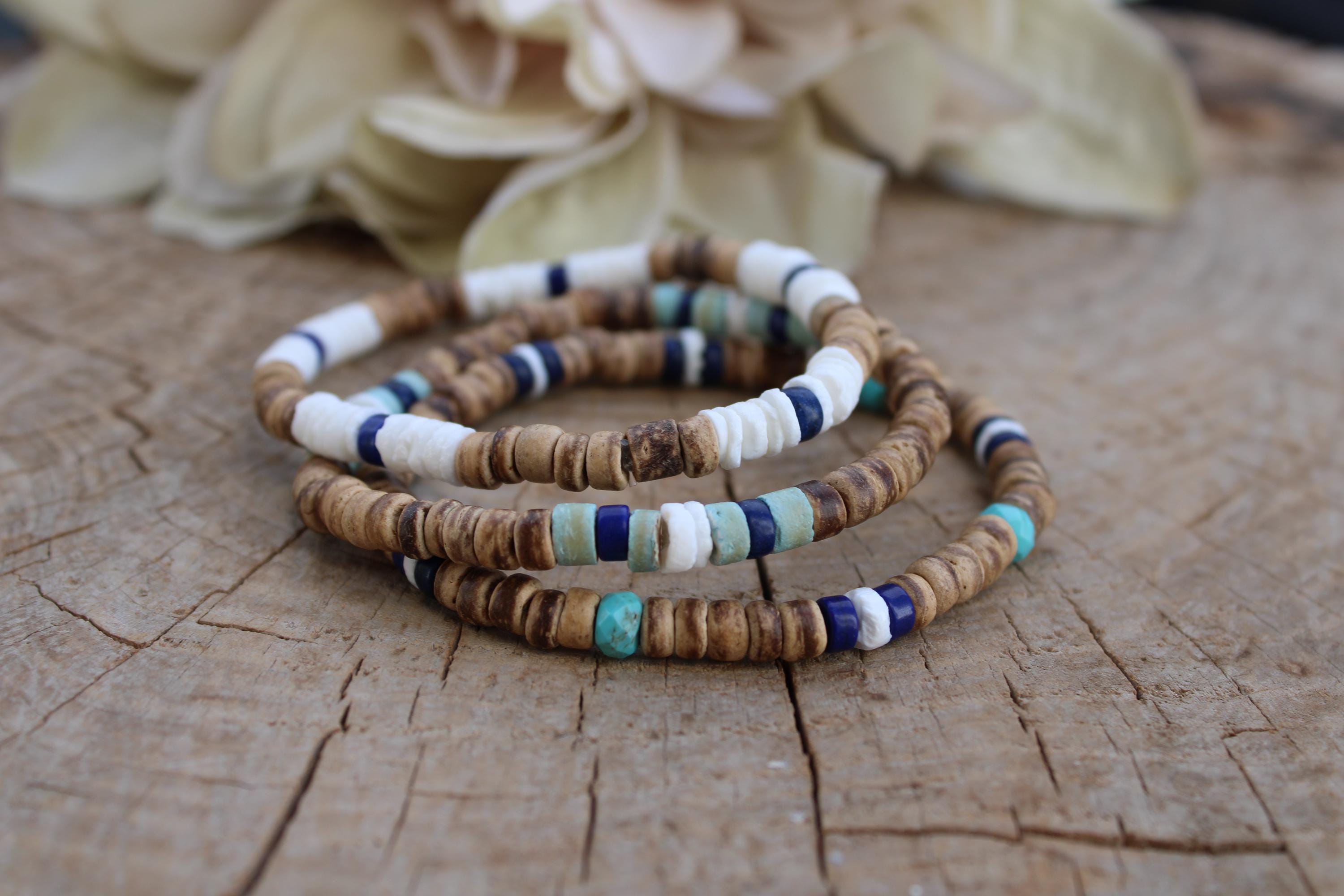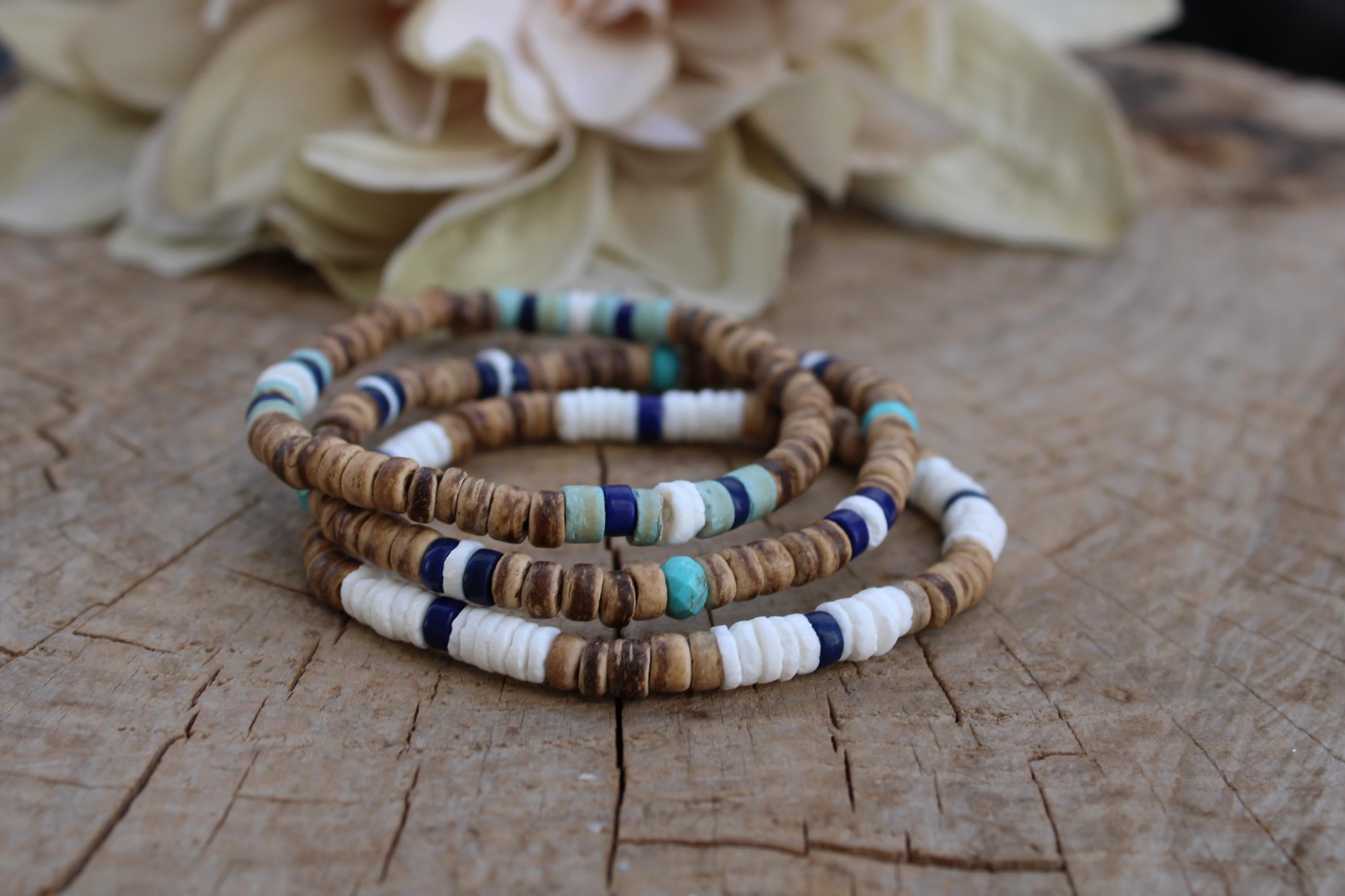â˘Made with natural coconut, dyed coloured coconut beads from the Philippines. white puka shell heishi beads, stone heishi beads and magnesite.