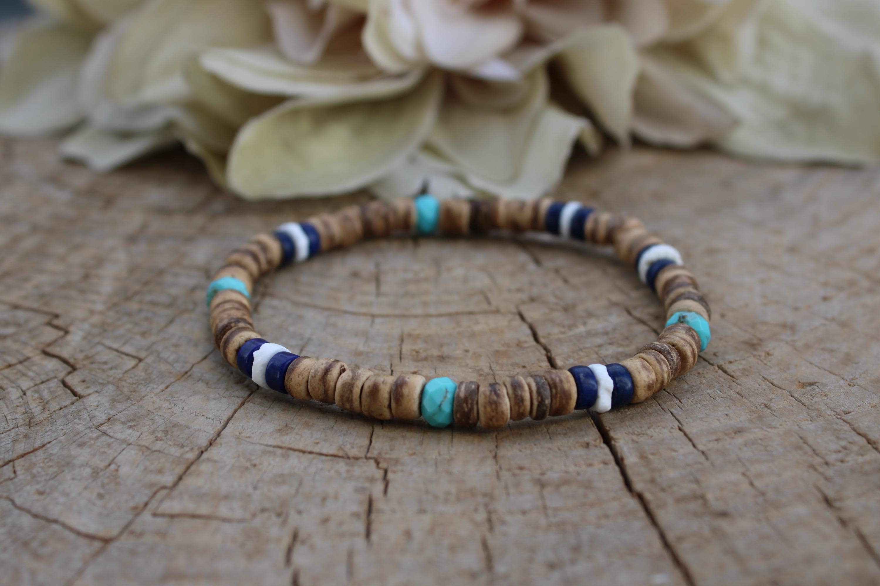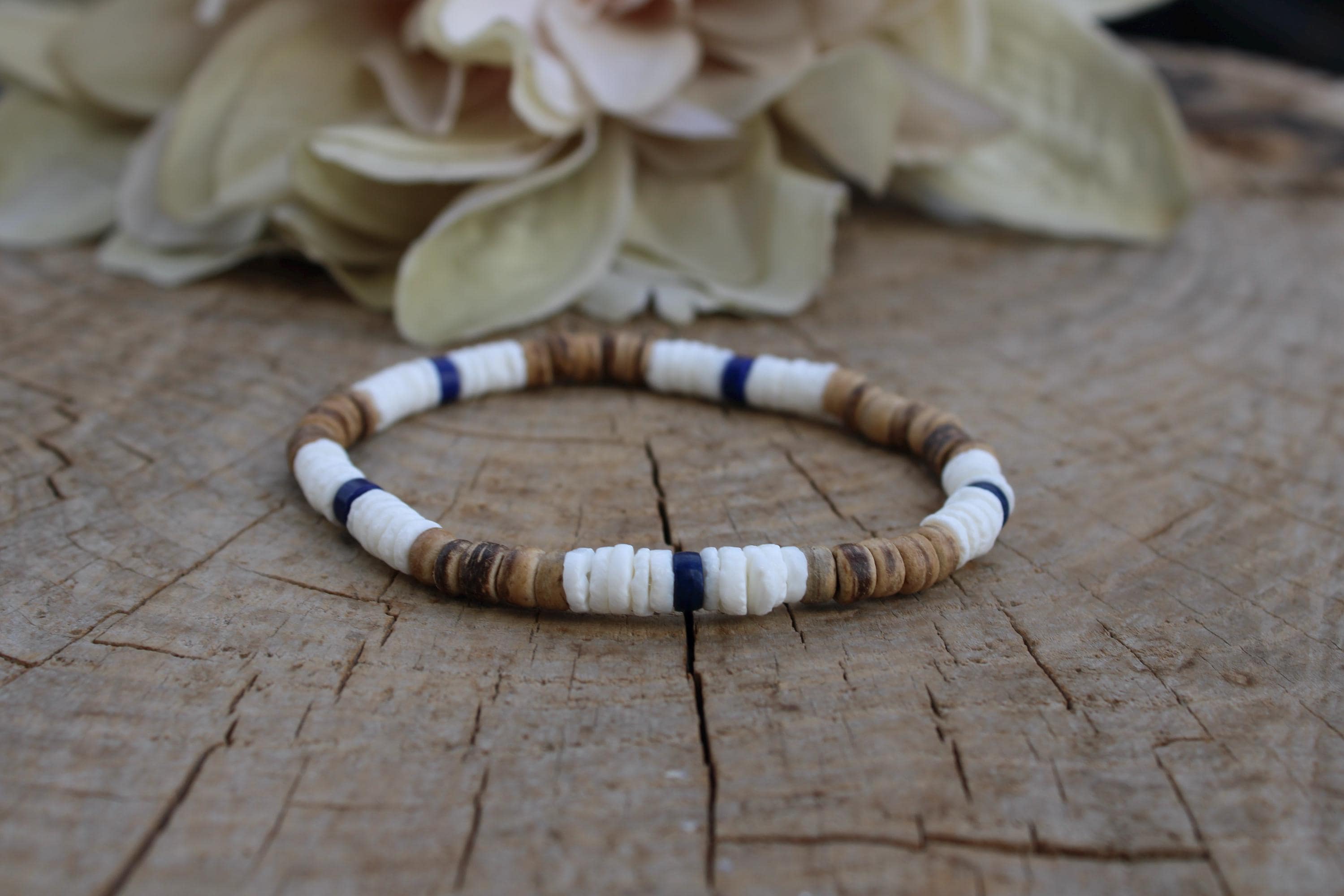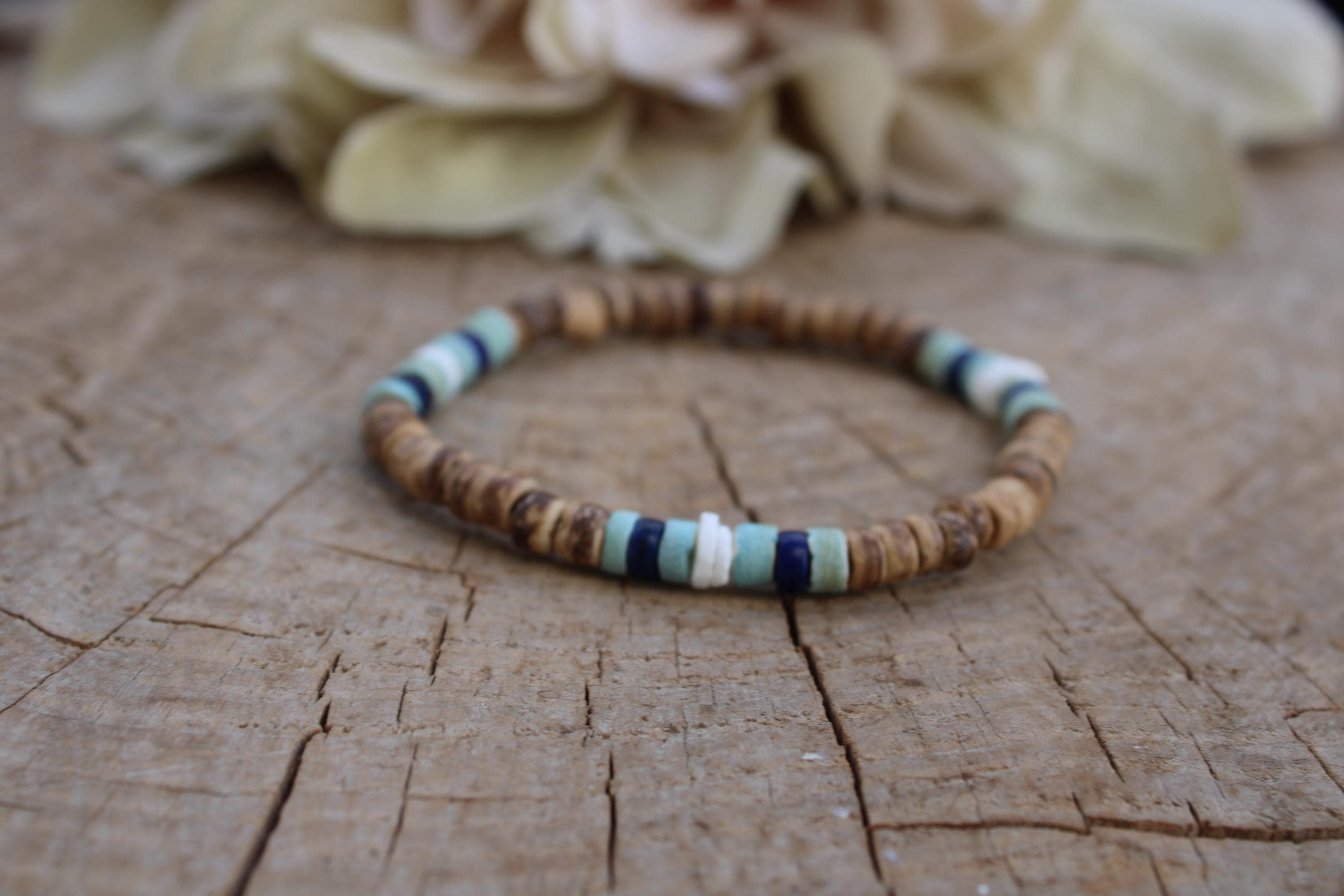 â˘Made with natural coconut, dyed coloured coconut beads from the Philippines. white puka shell heishi beads, stone heishi beads and magnesite.