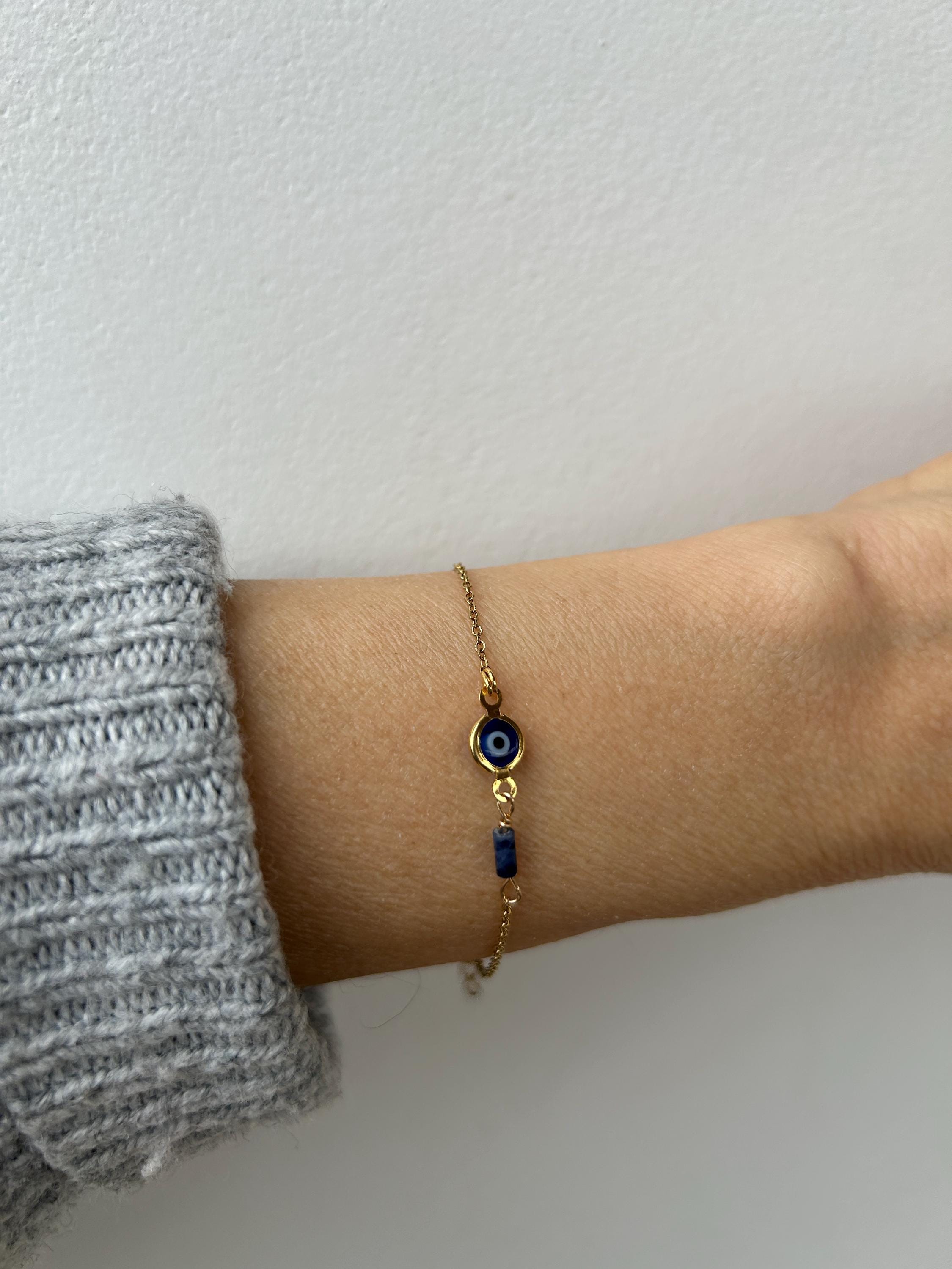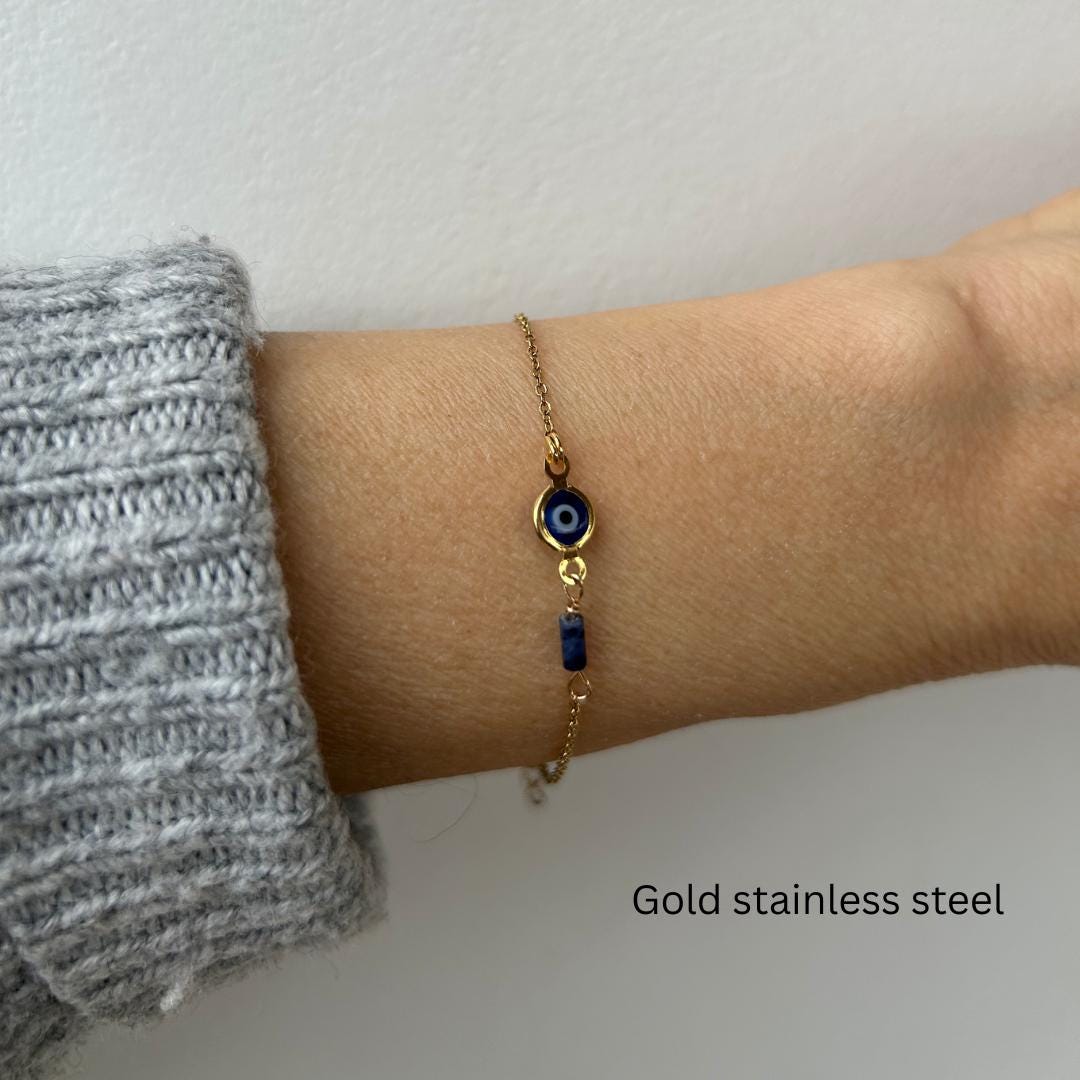 •It features an evil eye charm (12 x 6.5mm) in traditional blue and a dainty sodalite bead that has been wire wrapped to the chain.
